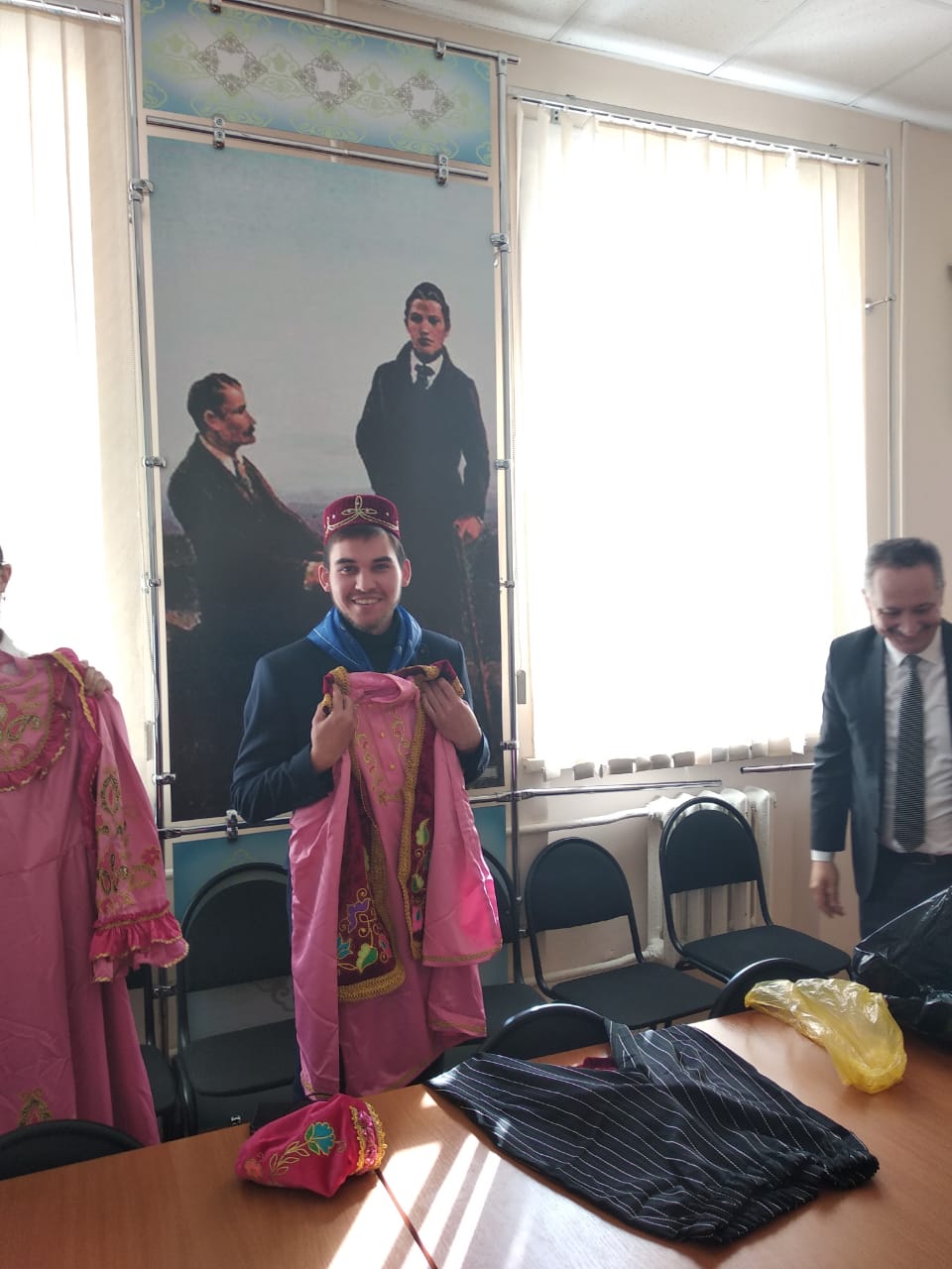 Ринат Закиров вручил кафедре подарок Президента Республики Татарстан – «Караоке. Лучшие татарские песни», а также передал от Исполкома ВКТ два национальных костюма для вокального ансамбля «Сәйләннәр» и большое количество учебно-методической и художественной литературы.