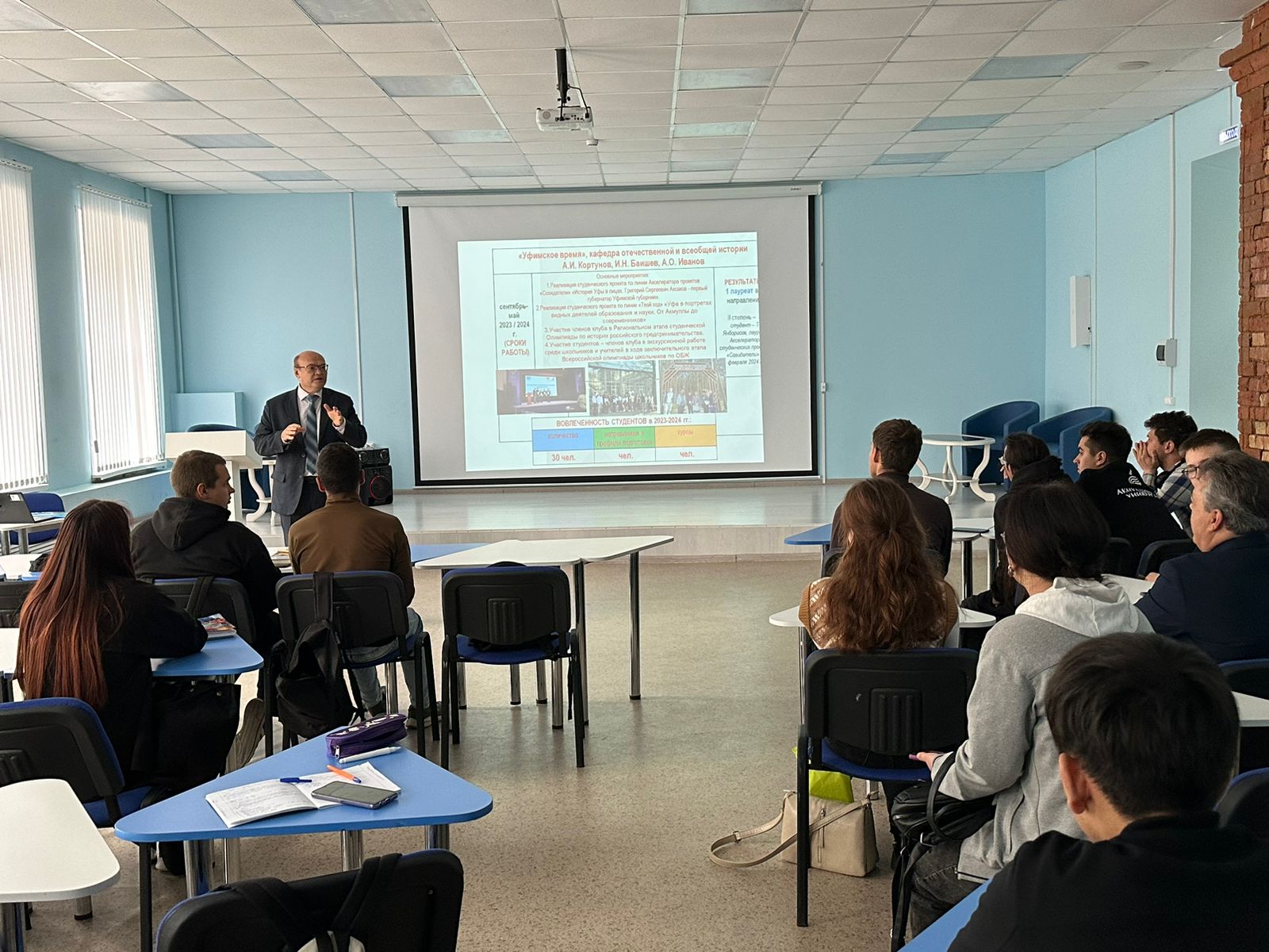 7 октября 2024 г. состоялось организационное заседание студенческого историко-краеведческого клуба «Уфимское время». В 2023/2024 учебном году обязанности руководителя клуба исполнял доцент И.Н. Баишев. Он отчитался о работе клуба за прошедший год, выделив при этом такие ключевые направления деятельности, как проектная работа, экскурсионная и научно-исследовательская работа.