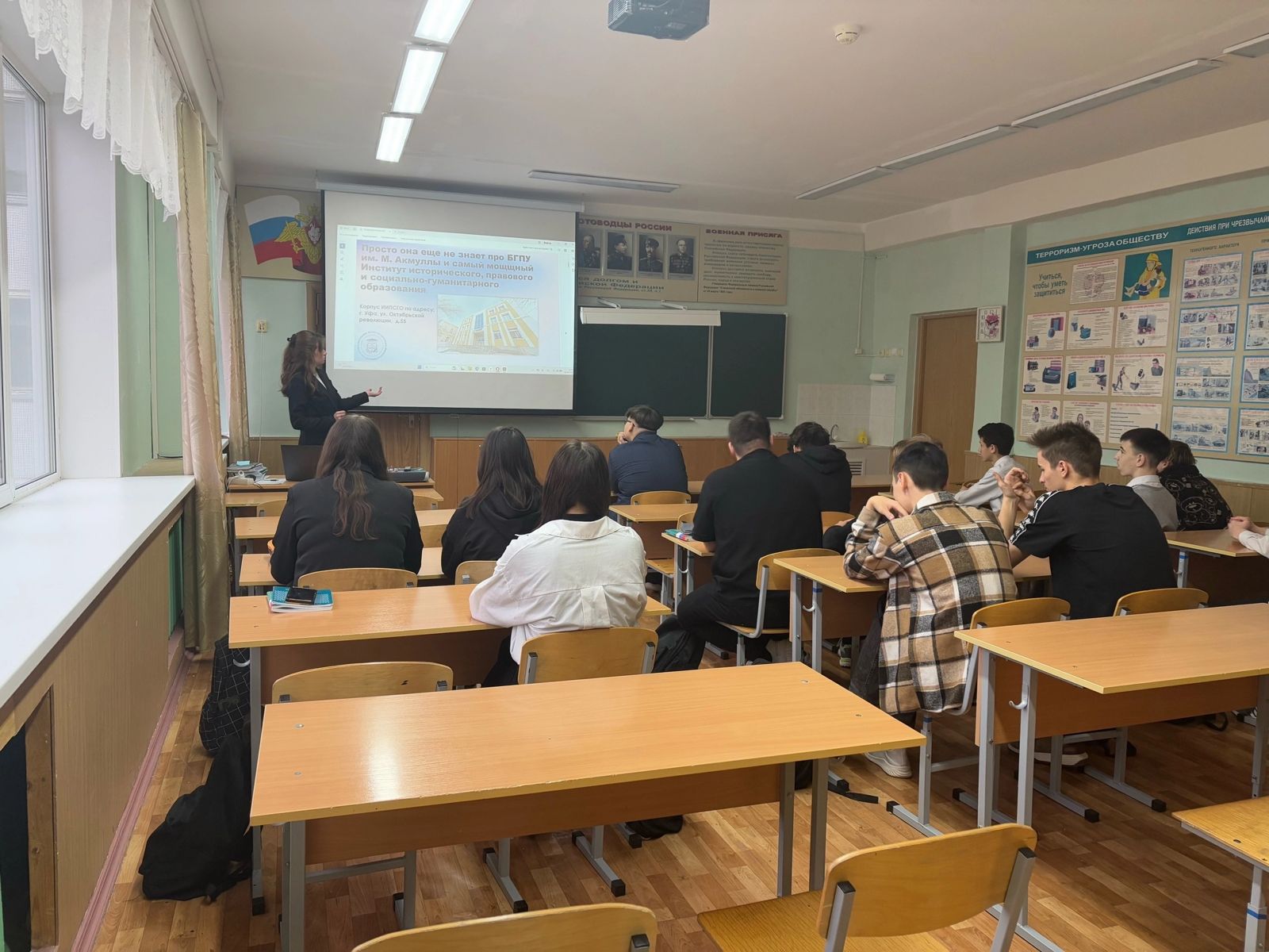 В течение последней недели ноября и первой недели декабря 2025 года студенты 4 курса ИИПСГО (профиль «История и обществознание») в ходе прохождения педагогической практики провели ряд профориентационных мероприятий в старших классах общеобразовательных школ г. Уфы, Нефтекамска и Агидели.