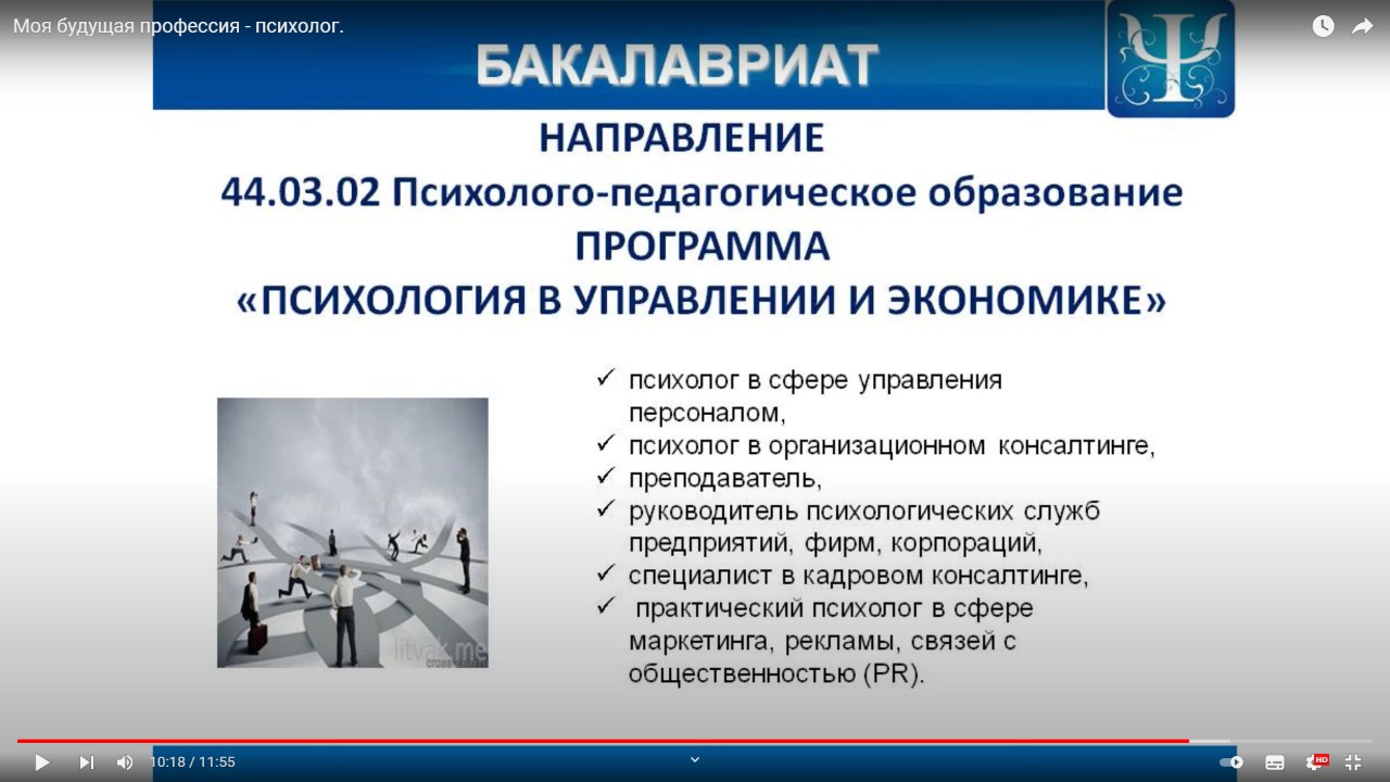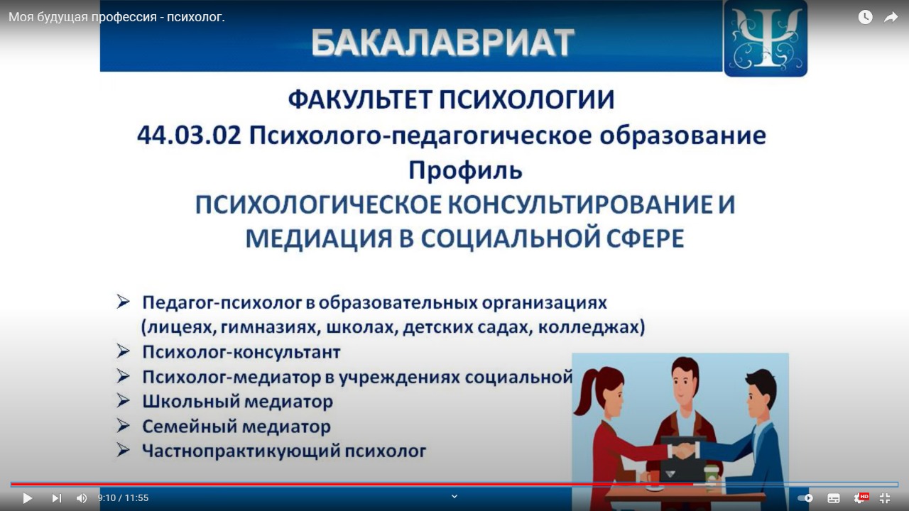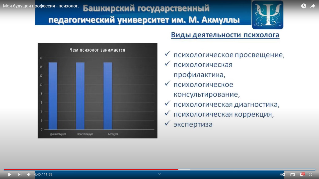 В рамках просветительско-образовательного проекта «Университетские субботы» 18 декабря 2021 года заместителем декана по научным и общим вопросам факультета психологии Тимерьяновой Лилией Николаевной проведено профориентационное мероприятие «Моя будущая профессия- психолог». В рамках занятия обучающиеся и их родители были ознакомлены с профессией психолога, узнали о запросах, с которыми работает психолог, основными направлениями его деятельности. Участники мероприятия получили исчерпывающую информацию о программах обучения на факультете психологии БГПУ им. М. Акмуллы. Ссылка на мероприятие: https://youtu.be/vGAe4utvBDw