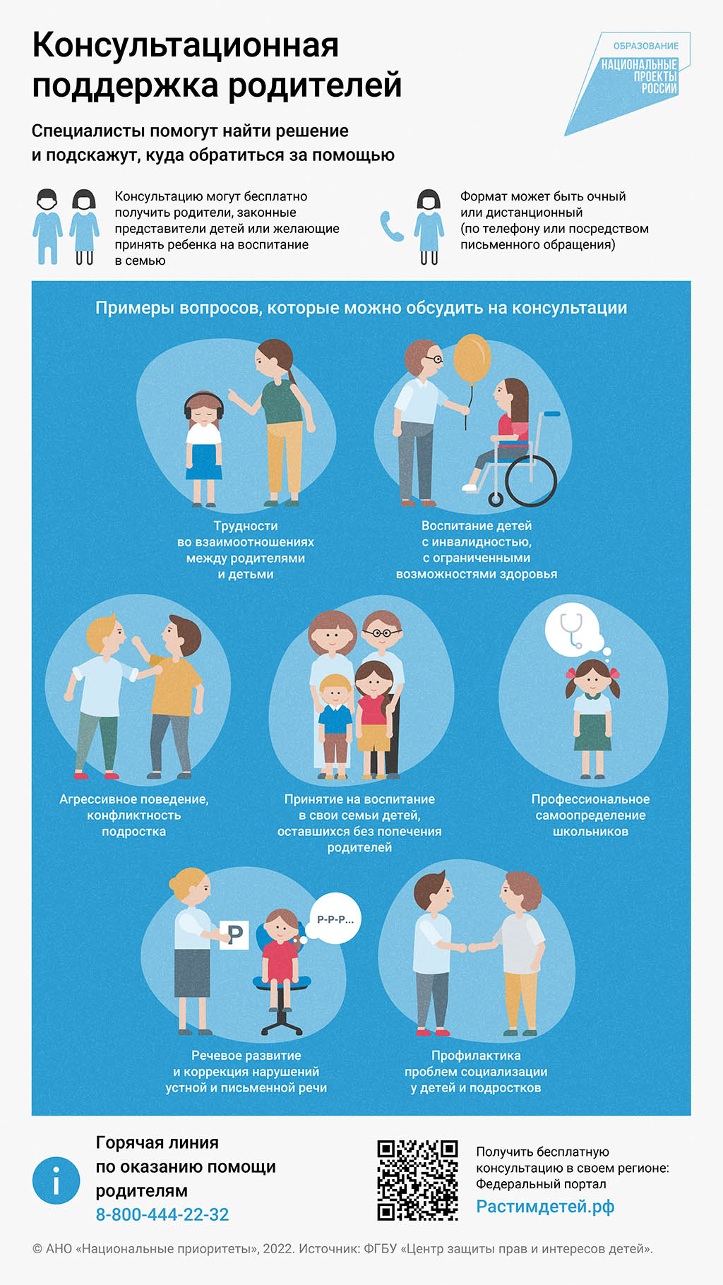 Прежде всего проект предполагает бесплатную психолого-педагогическую, методическую и консультативную помощь родителям, а также людям, которые планируют принять ребенка на воспитание в семью. Специалисты девяти ведущих педагогических вузов и 150 некоммерческих организаций всегда готовы проконсультировать родителей по всем вопросам, связанным с воспитанием и развитием детей в любом удобном формате: очно, по телефону или в письменном виде.