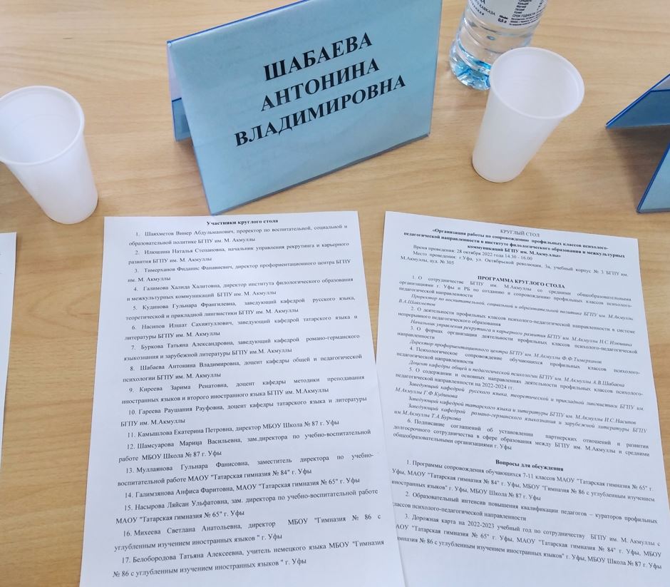 28 октября 2022 г. в Институте филологического образования и межкультурных коммуникаций БГПУ им. М. Акмуллы был организован круглый стол «Организация работы по сопровождению профильных классов психолого-педагогической направленности в институте филологического образования и межкультурных коммуникаций БГПУ им. М. Акмуллы». В рамках работы круглого стола обсуждались вопросы: 1. Программы сопровождения обучающихся 7-11 классов МБОУ Школа № 87 г. Уфы, МАОУ "Татарская гимназия № 84" г. Уфы, МБОУ "Татарская гимназия № 65" г. Уфы, МБОУ "Гимназия № 86 с углубленным изучением иностранных языков" г. Уфы 2. Образовательный интенсив повышения квалификации педагогов – кураторов профильных классов психолого-педагогической направленности. В работе круглого стола принимали участие: директор института филологического образования и межкультурных коммуникаций БГПУ им. М.Акмуллы Х.Х. Галимова, начальник управления рекрутинга и карьерного развития БГПУ им. М.Акмуллы Н.С.Илюшина, директор профориентационного центра БГПУ им. М.Акмуллы Ф.Ф.Тимерханов, заведующий кафедрой русского языка, теоретической и прикладной лингвистики БГПУ им. М.Акмуллы Г.Ф.Кудинова, заведующий кафедрой татарского языка и литературы БГПУ им. М.Акмуллы И.С.Насипов, заведующий кафедрой романо-германского языкознания и зарубежной литературы БГПУ им.М.Акмуллы Т.А.Буркова, представители администрации средних общеобразовательных организаций г. Уфы. Факультет психологии представляла доцент кафедры общей и педагогической психологии БГПУ им. М. Акмуллы Шабаева Антонина Владимировна. Она выступила с докладом о психологическом сопровождении обучающихся профильных классов психолого-педагогической направленности. Были представлены основные направления работы и первые результаты деятельности психолого-педагогических классов. Результатом работы круглого стола стало подписание соглашений об установлении партнерских отношений и развитии долгосрочного сотрудничества в сфере образования между БГПУ им. М.Акмуллы и средними общеобразовательными организациями г. Уфы