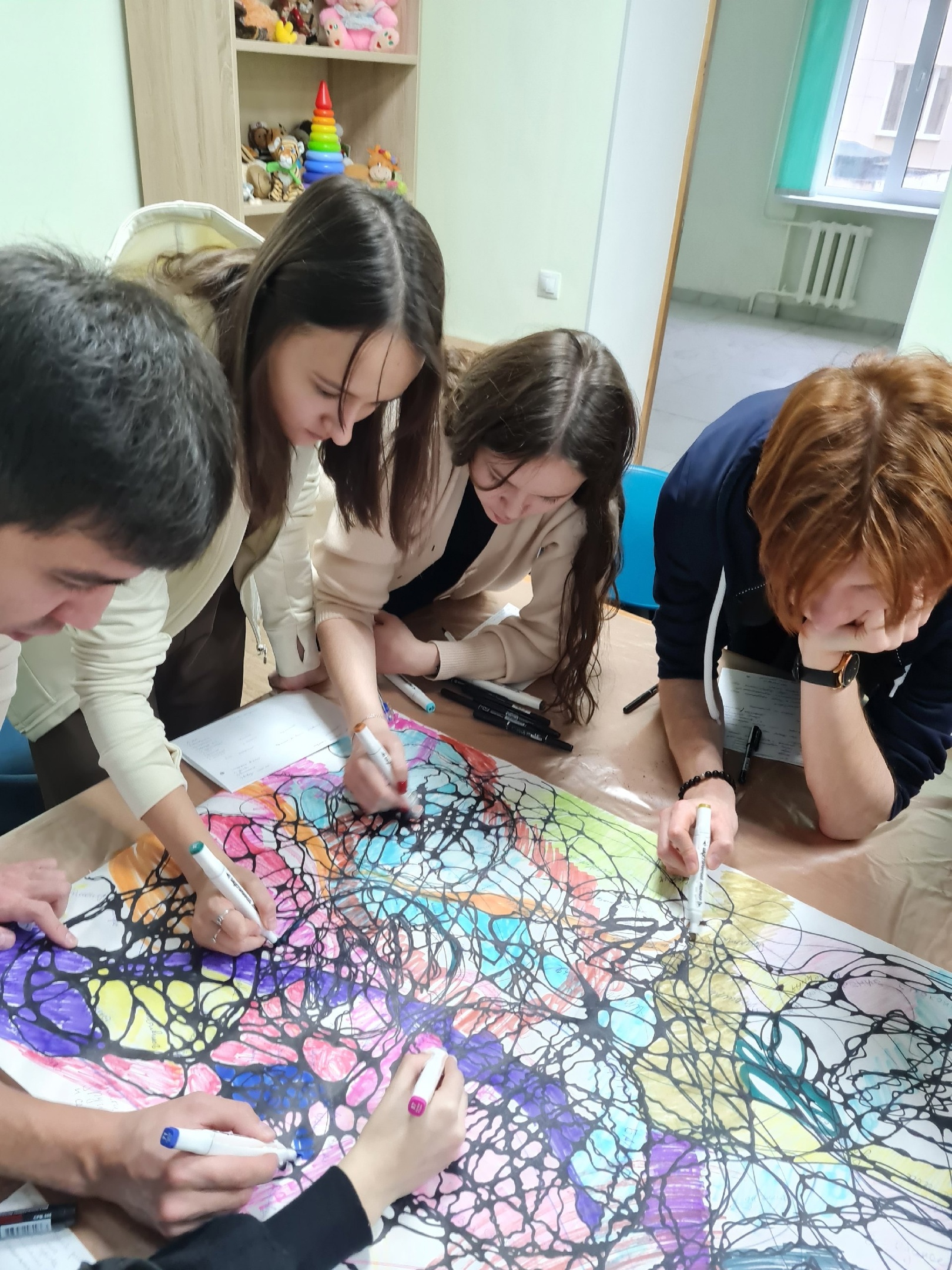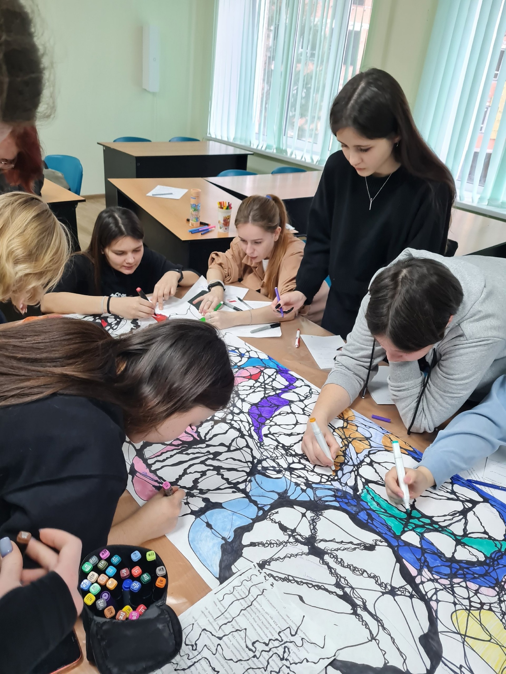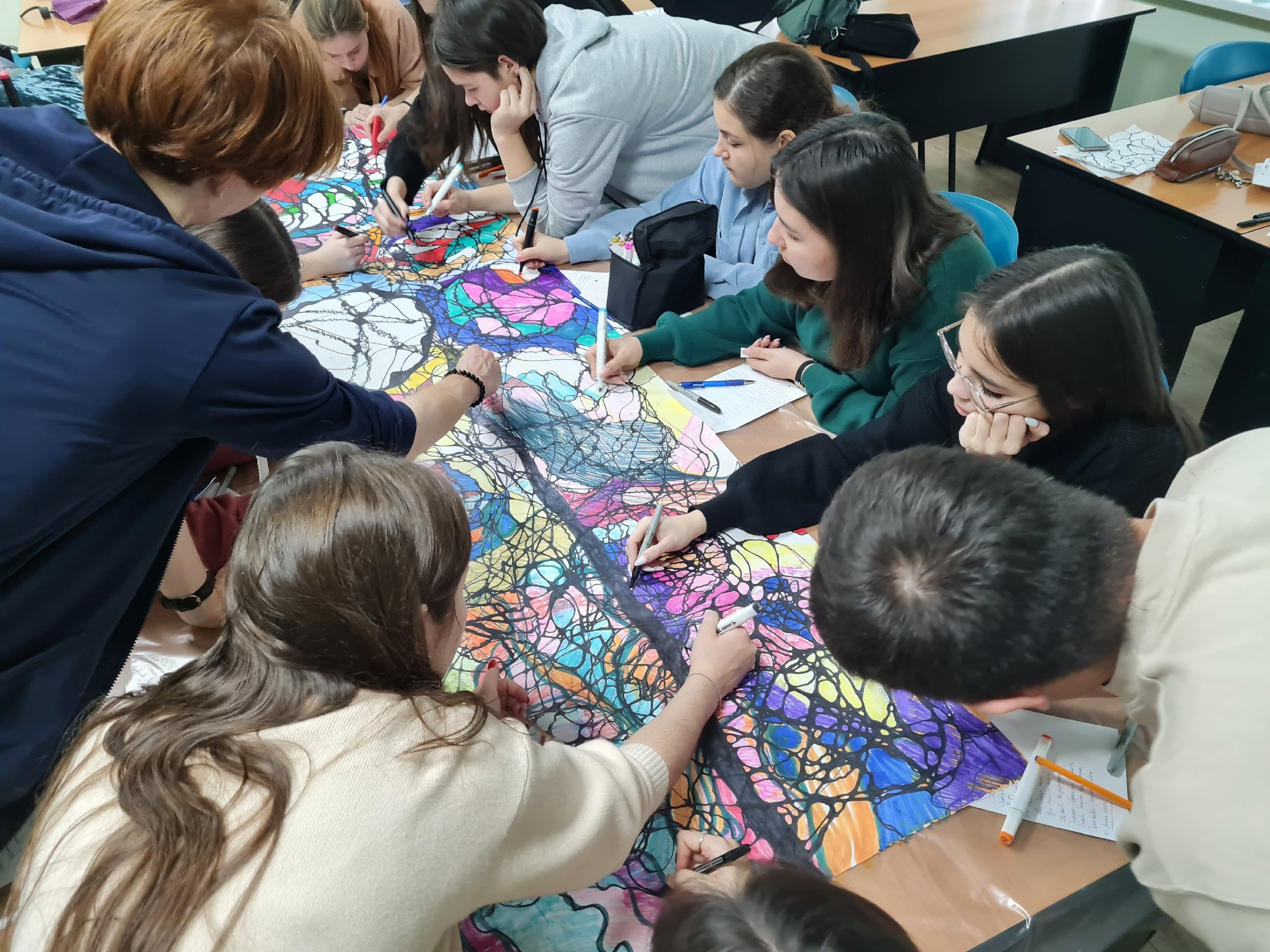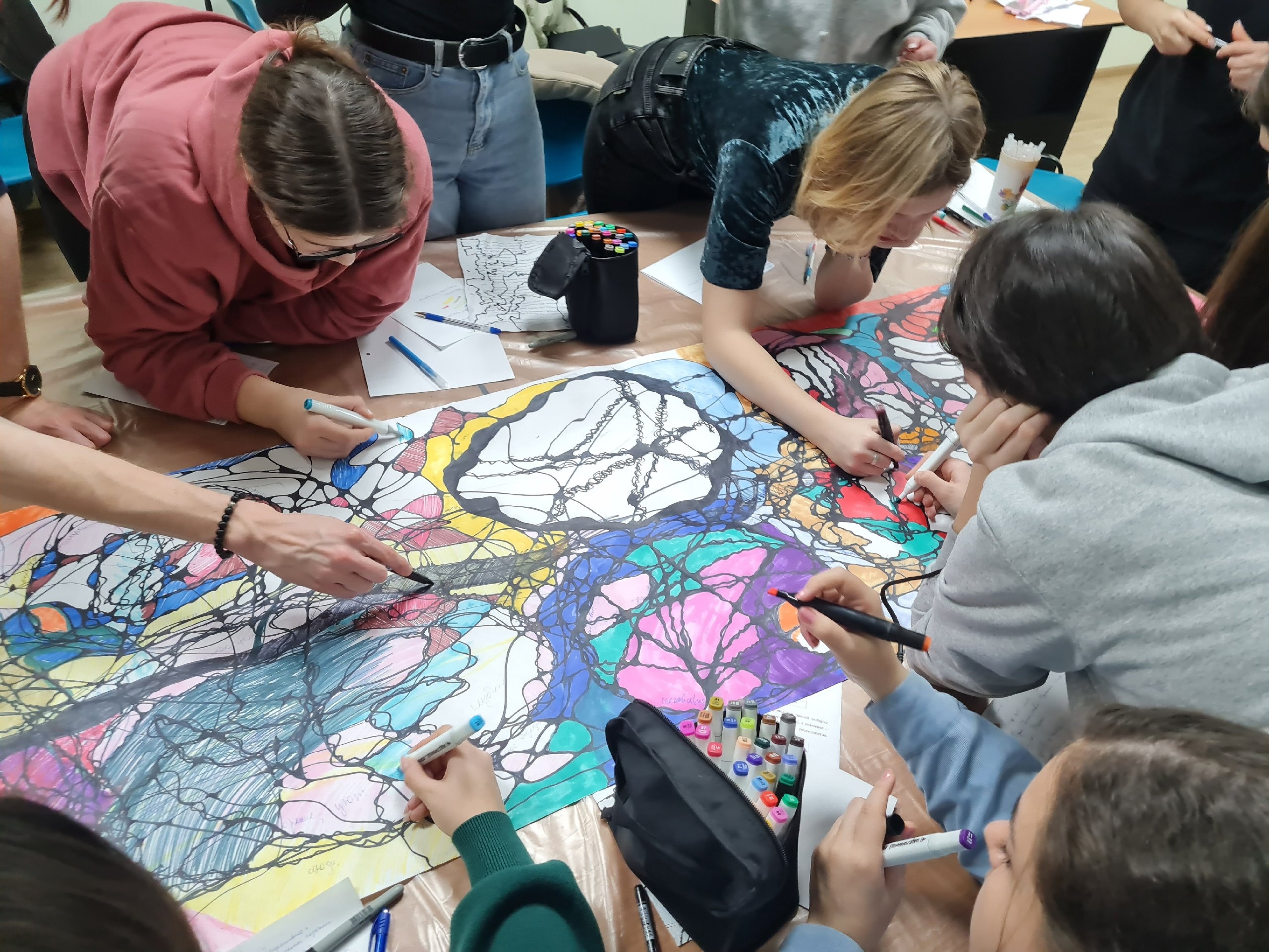 Ребята рисовали нейрографику на тему: "Мир во мне, мир вокруг меня". Студенты познакомились с новым методом психологической работы, увидели, что каждый вносит в группу,  и получили художественный шедевр группы.