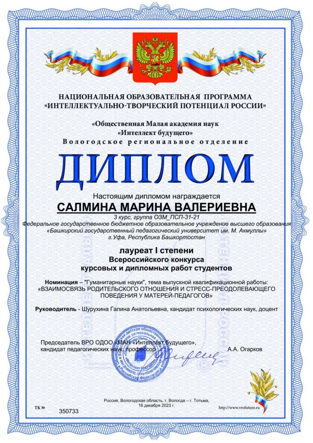 Научным руководителем Марины Салминой является к.пс.н., доцент кафедры возрастной и социальной психологии БГПУ им. М. Акмуллы Шурухина Галина Анатольевна. Поздравляем Марину Валерьевну  победой и желаем успешной защиты!