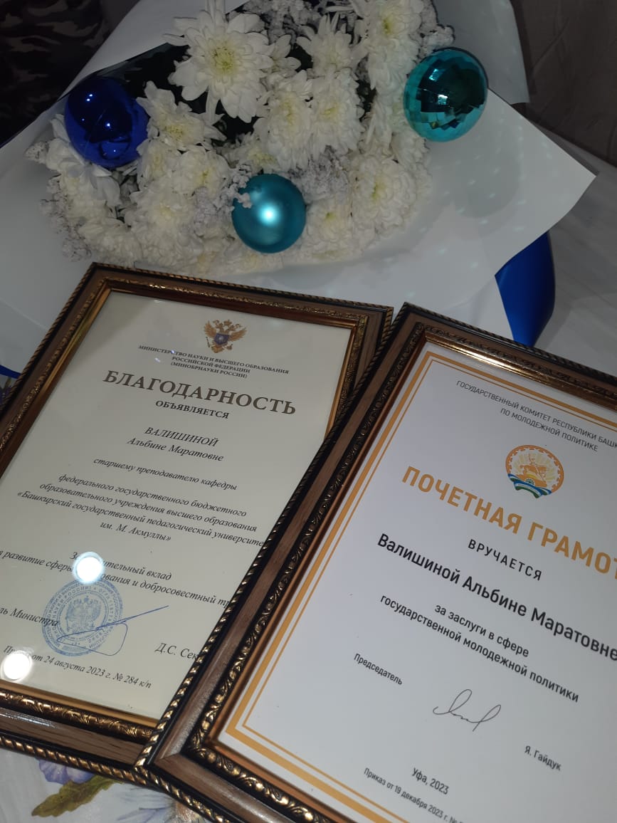 Альбина Валишина также была награждена почетной грамотой Государственного комитета Республики Башкортостан по молодежной политике «За заслуги в сфере государственной молодежной политики», подписанной председателем Яной Гайдук.