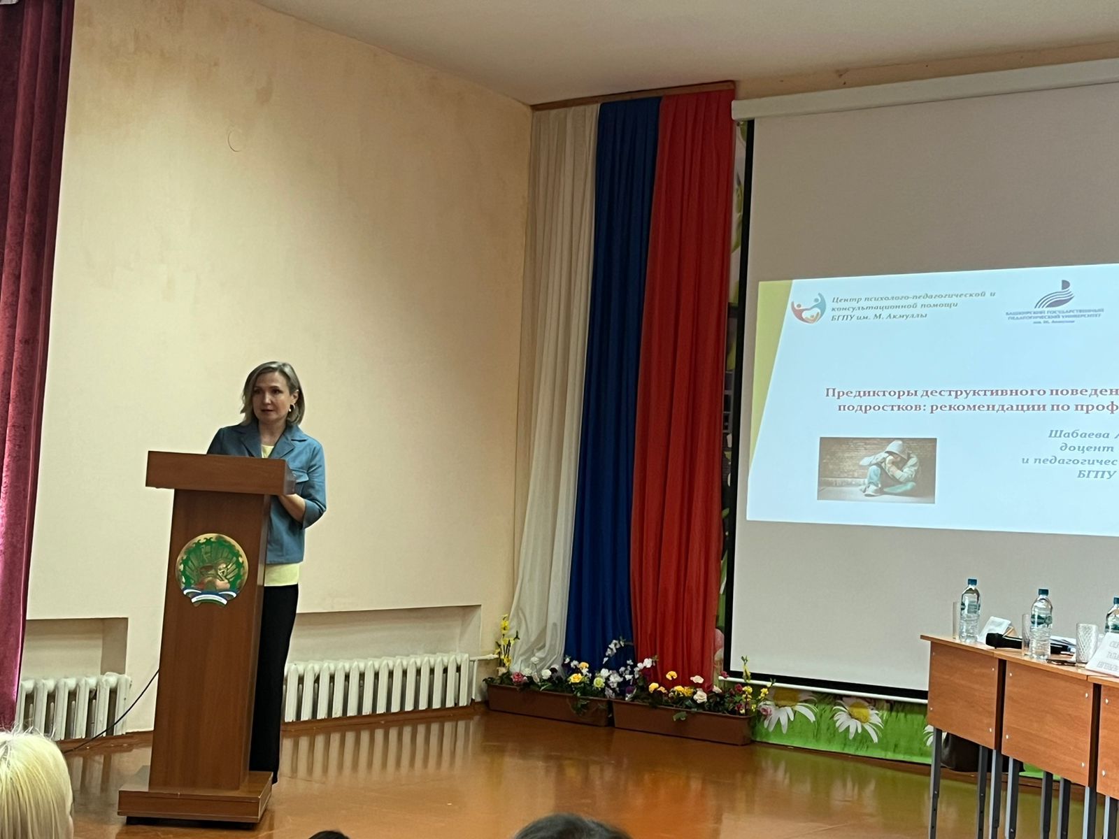 28 августа в рамках августовского совещания по образованию «Воспитание и социализация в системе образования: новые вызовы и условия» на базе МБОУ СОШ д. Юматово Уфимского района доцент Антонина Шабаева выступила с докладом «Предикторы деструктивных проявлений у детей и подростков: рекомендации по профилактике».