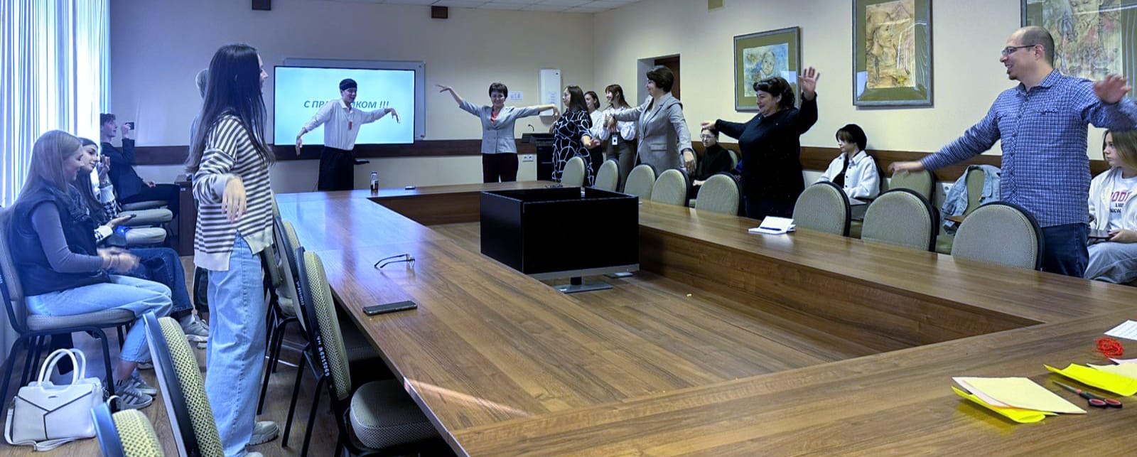 Занятие началось с утренней гимнастики для преподавателей и сотрудников под руководством Даниса Бакирова. «Новоиспеченные студенты» участвовали в блиц-опросе, выполняли интересные задания, давали интервью, составляли словарь самых популярных выражений студентов.