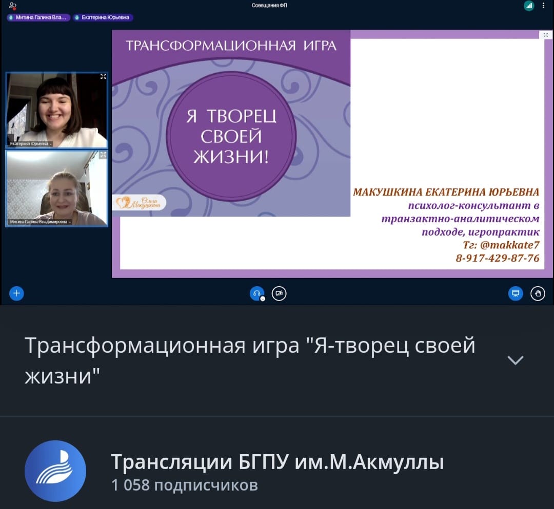 Выступая с докладом «Роль трансформационных игр в социально-психологической практике» Ольга Макушкина подчеркнула важность новой эффективной формы социально-психологической практики, которая требует более глубокого изучения и внедрение в образовательные программы подготовки психологов.  А также рассказала об опыте на факультета психологии изучения трансформационных психологических игр в рамках учебной технологической практики (игровые технологии) при подготовки бакалавров по направлению 44.03.01- Психолого-педагогическое образование по профилю «Индивидуальное психологическое консультирование и медиация в социальной сфере». Благодаря этому опыту студентами факультета создан Клуб Трансформационных Игр, где студенты старших курсов проводят встречи на различные темы, используя т-игру как инструмент. На конференции для участников магистрант 1 курса Екатерина Макушкиной провела в онлайн - формате мастер-класс трансформационная игра «Я творец своей жизни».