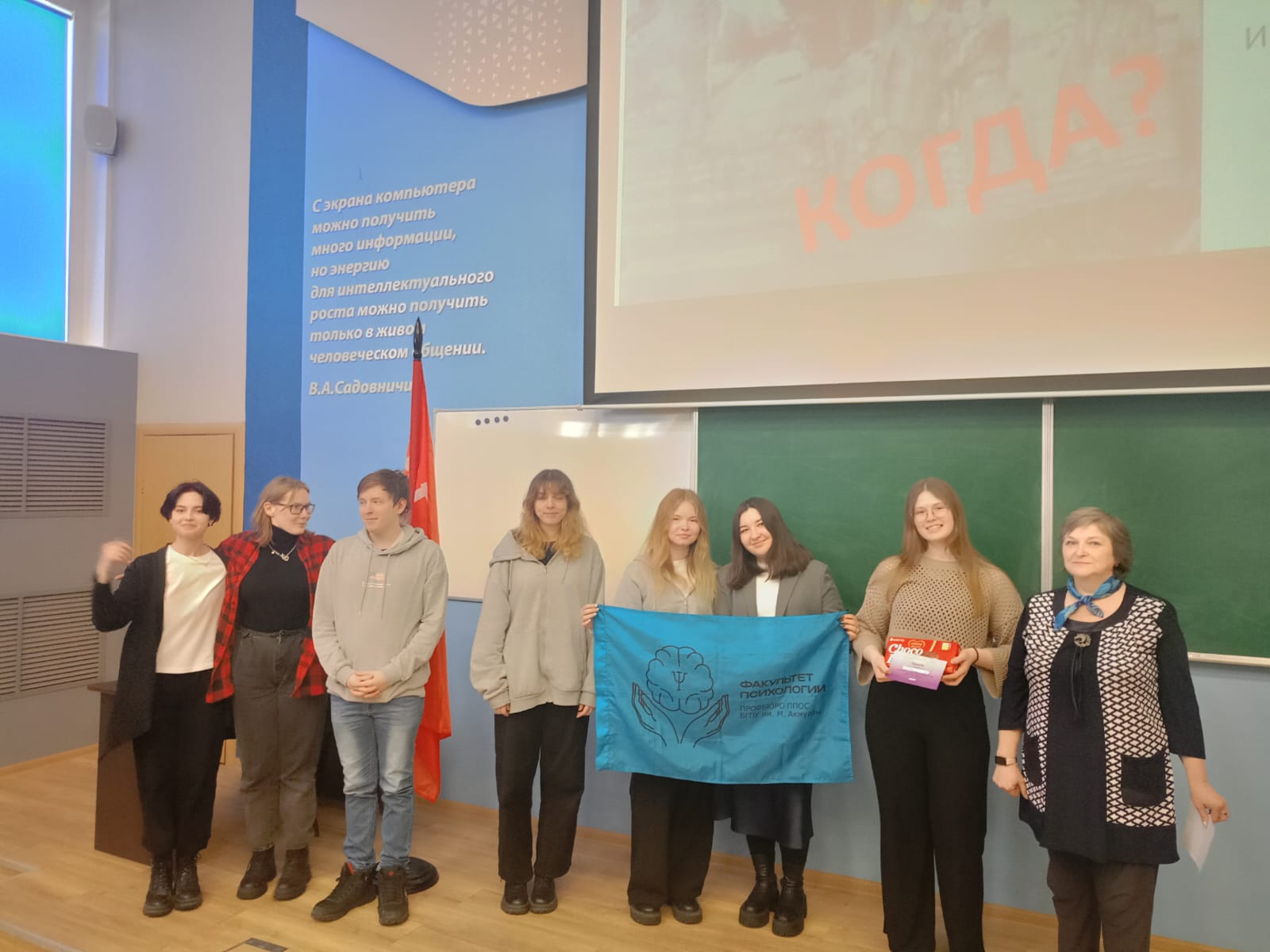 Сборная команда студентов факультета психологии под руководством капитана, студентки 3 курса специальности «Педагогика и психология девиантного поведения» Карины Сафиной показали хорошие знания по истории Великой Отечественной войны, проявили эрудицию и завоевали 3 место! Поздравляем команду и желаем новых достижений!