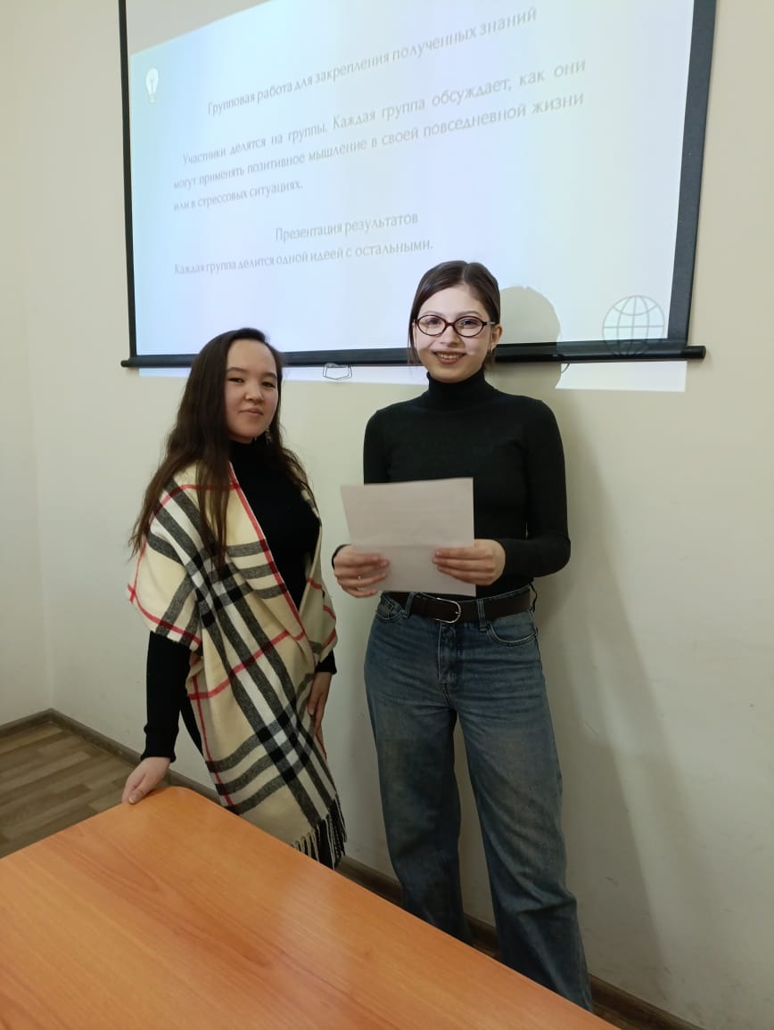 Студенты познакомились с такими техниками позитивного мышления, как аффирмация, визуализация и благодарность. Тренинг прошел в формате активного взаимодействия, где участники не только получали теоретические знания, но и закрепляли их через практические упражнения в группах. Такой подход позволил ребятам не только освоить новые техники, но и обменяться опытом по их применению в реальных жизненных ситуациях.