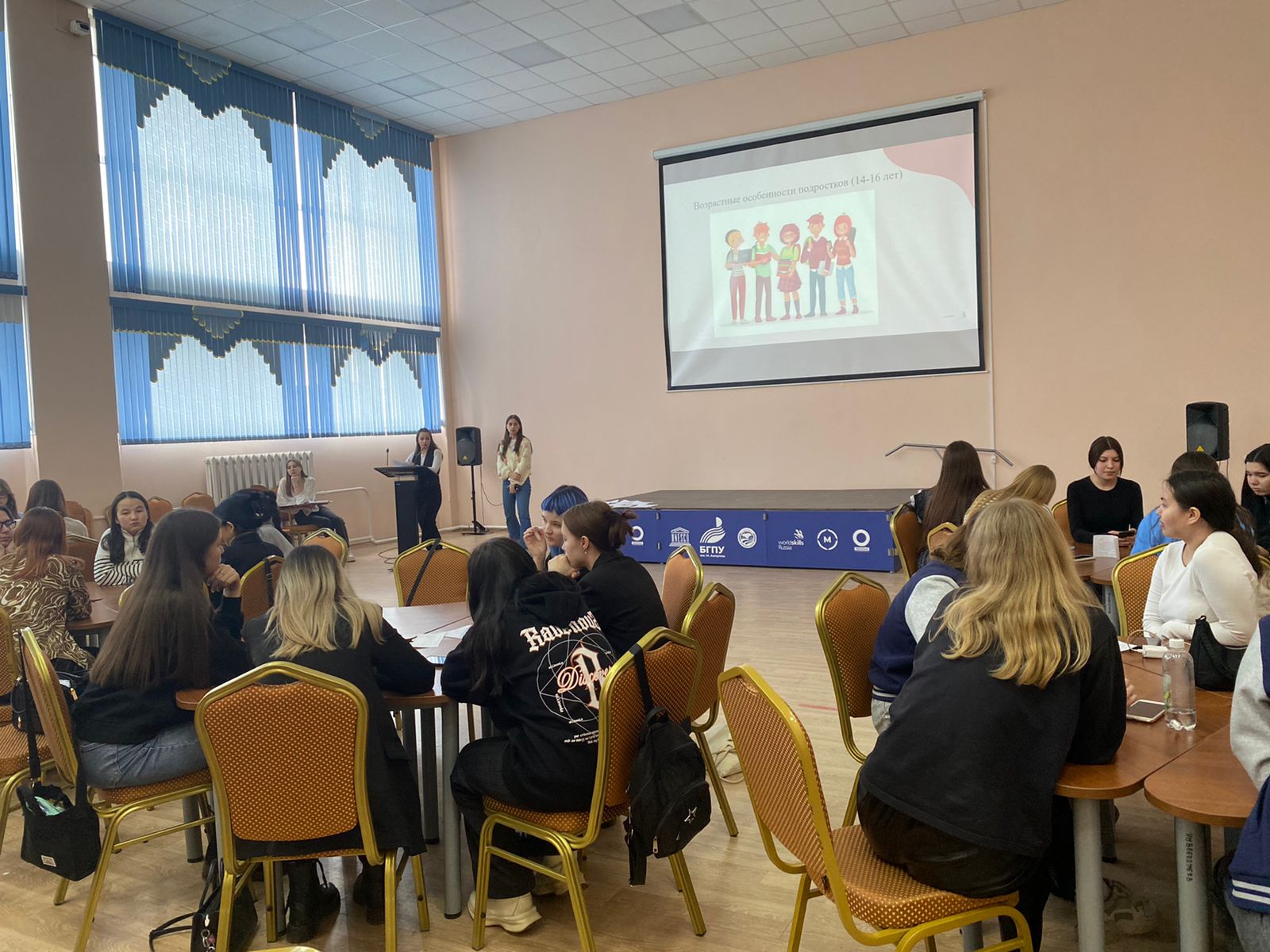 Студенты 2 курса Института педагогики приняли участие в тренинге «Эффективное взаимодействие с детьми различного возраста в период вожатской практики», на котором узнали об особенностях детей каждого возраста и правила общения с ними, будучи вожатым.