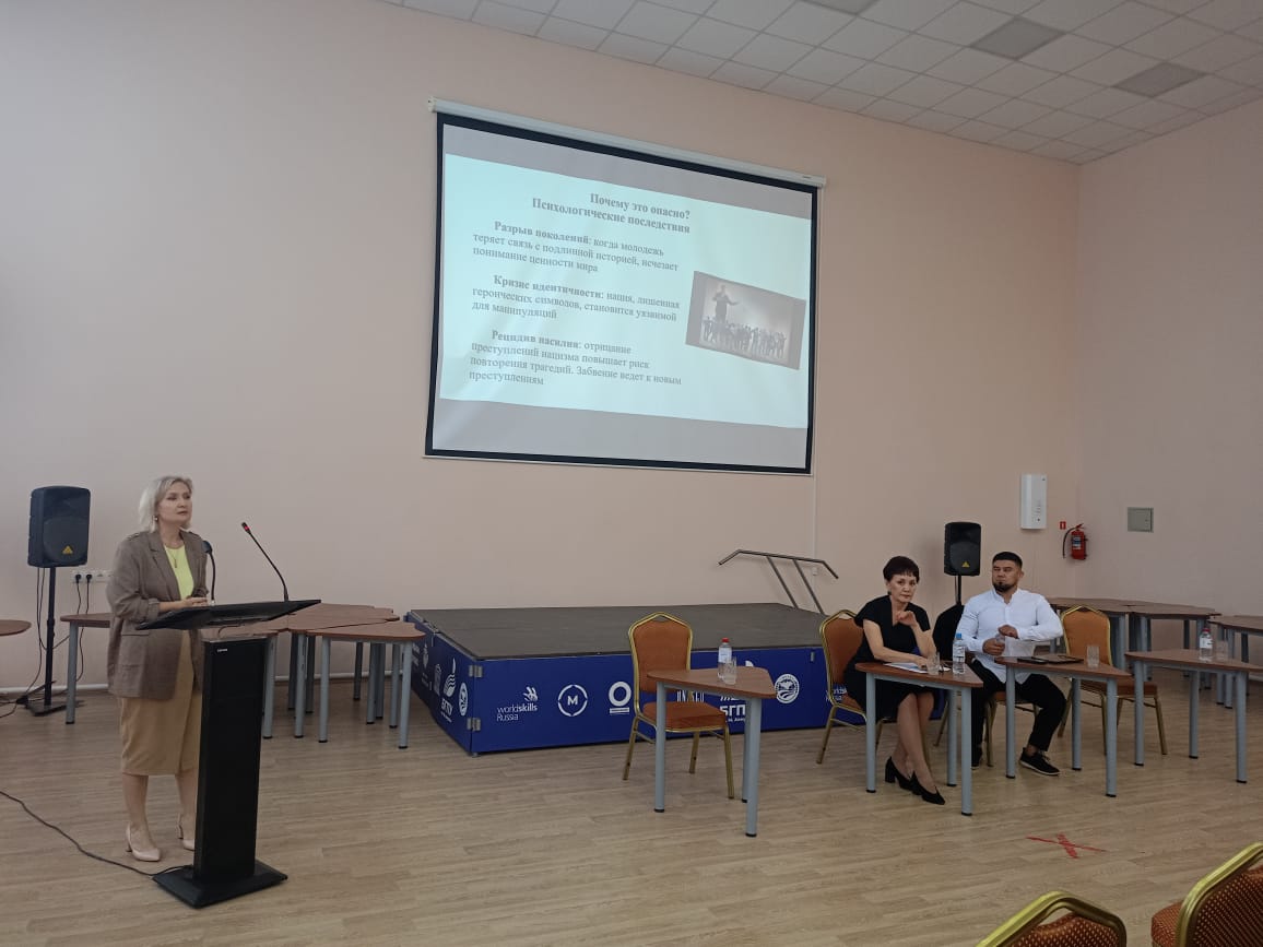 Доцент кафедры общей и педагогической психологии Антонина Шабаева  изложила проблему, как фейки искажают историю Великой Отечественной войны, в чем их опасность, каковы психологические последствия.