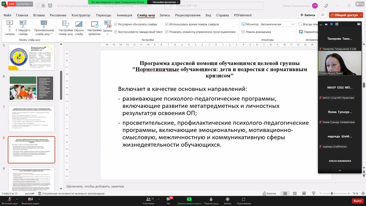 В рамках "Недели психологии"  19 октября  2022 г.  на Факультете психологии состоялся республиканский научно-методический вебинар «Особенности деятельности психологических служб в общеобразовательных организациях на современном этапе». Спикером выступила и.о. заведующего кафедрой общей и педагогической психологии БГПУ им. М. Акмуллы Тимерьянова Лилия Николаевна. В мероприятии приняли участие  педагоги-психологи образовательных организаций и студенты, обучающиеся по психологическим направлениям. Были рассмотрены нормативные документы, регламентирующие деятельность  психологических служб образования. Определены целевые группы и специфика программ оказания им адресной психологической помощи. Рассмотрены особенности межведомственного взаимодействия  психологических служб с субъектами профилактики. Было представлено методическое сопровождение деятельности психологических служб образования. У участников была возможность задать вопросы. Участники выразили благодарность спикеру.