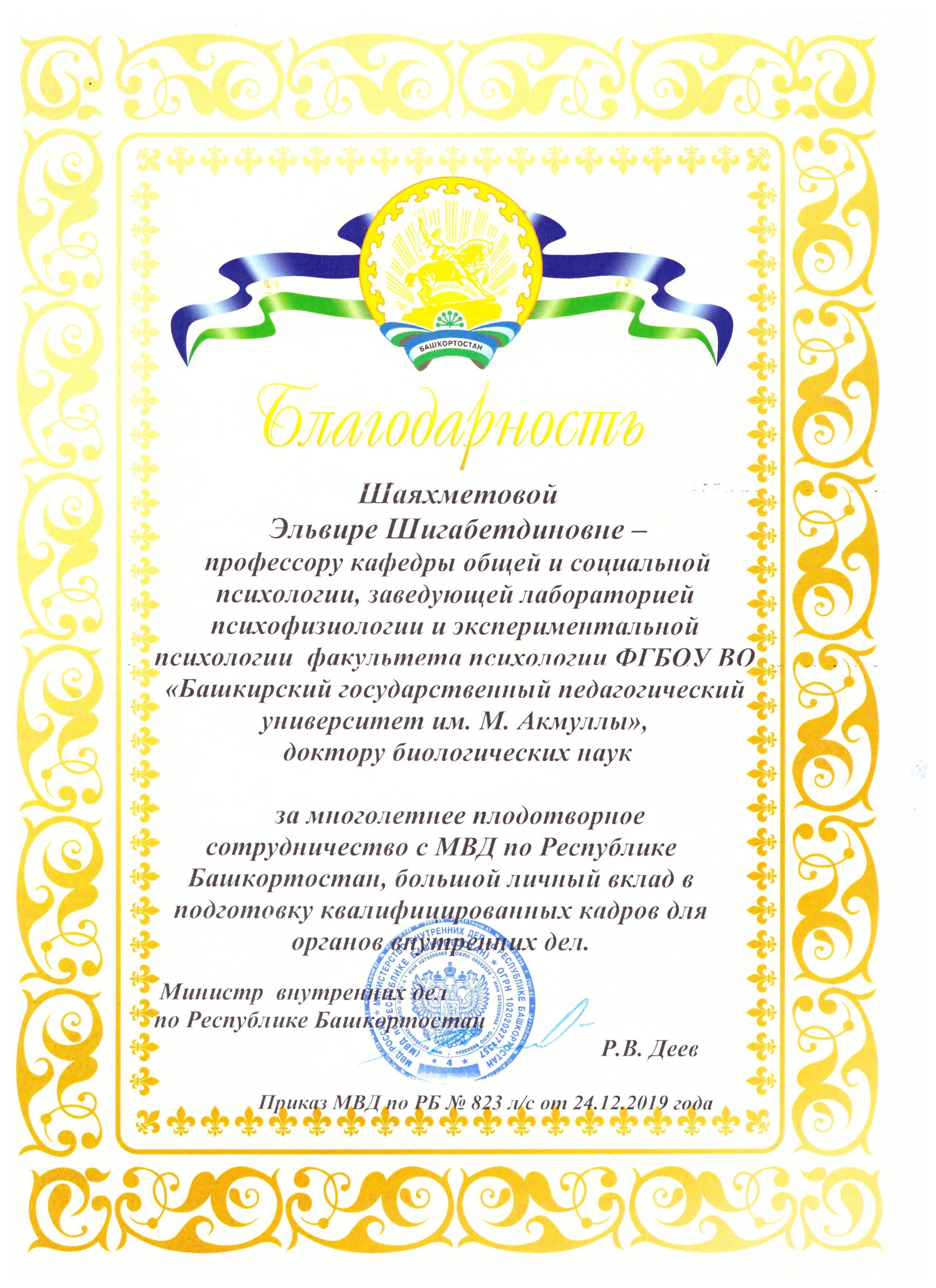Приказом Министерства внутренних дел по Республике Башкортостан № 823 л/с от 24.12. 2019 года зав.кафедрой общей и социальной доценту Марине Владимировне Нуховой и профессору кафедры Эльвире Шигабетдиновне Шаяхметовой была объявлена благодарность за многолетнее плодотворное сотрудничество С МВД по Республике Башкортостан, большой личный вклад в подготовку квалифицированных кадров для органов внутренних дел. Торжественное вручение благодарственных писем ректором БГПУ им. М. Акмуллы С.Т. Сагитовым состоялось на заседании Ученого совета университета 27 февраля 2020 года. Поздравляем коллег с заслуженной наградой!!!