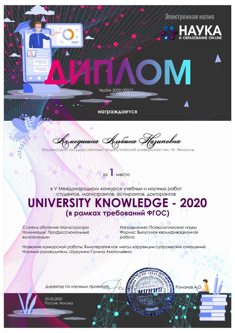Выпускница магистратуры факультета психологии Альбина Ахмедшина стала победителем V Международного конкурса учебных и научных работ студентов, магистрантов, аспирантов и докторантов  "UNIVERSITY KNOWLEDGE - 2020" в номинации "Профессиональные компетенции".