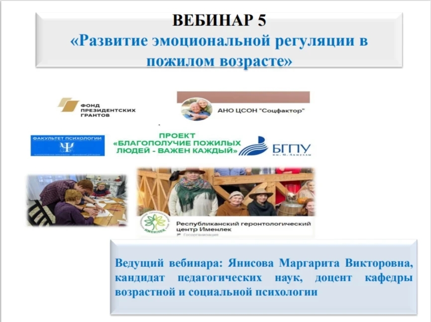 23 марта в рамках проекта прошёл пятый обучающий вебинар, посвящённый особенностям эмоциональной сферы в пожилом возрасте. Мероприятие провела Маргарита Викторовна Янисова, доцент кафедры возрастной и социальной психологии.
