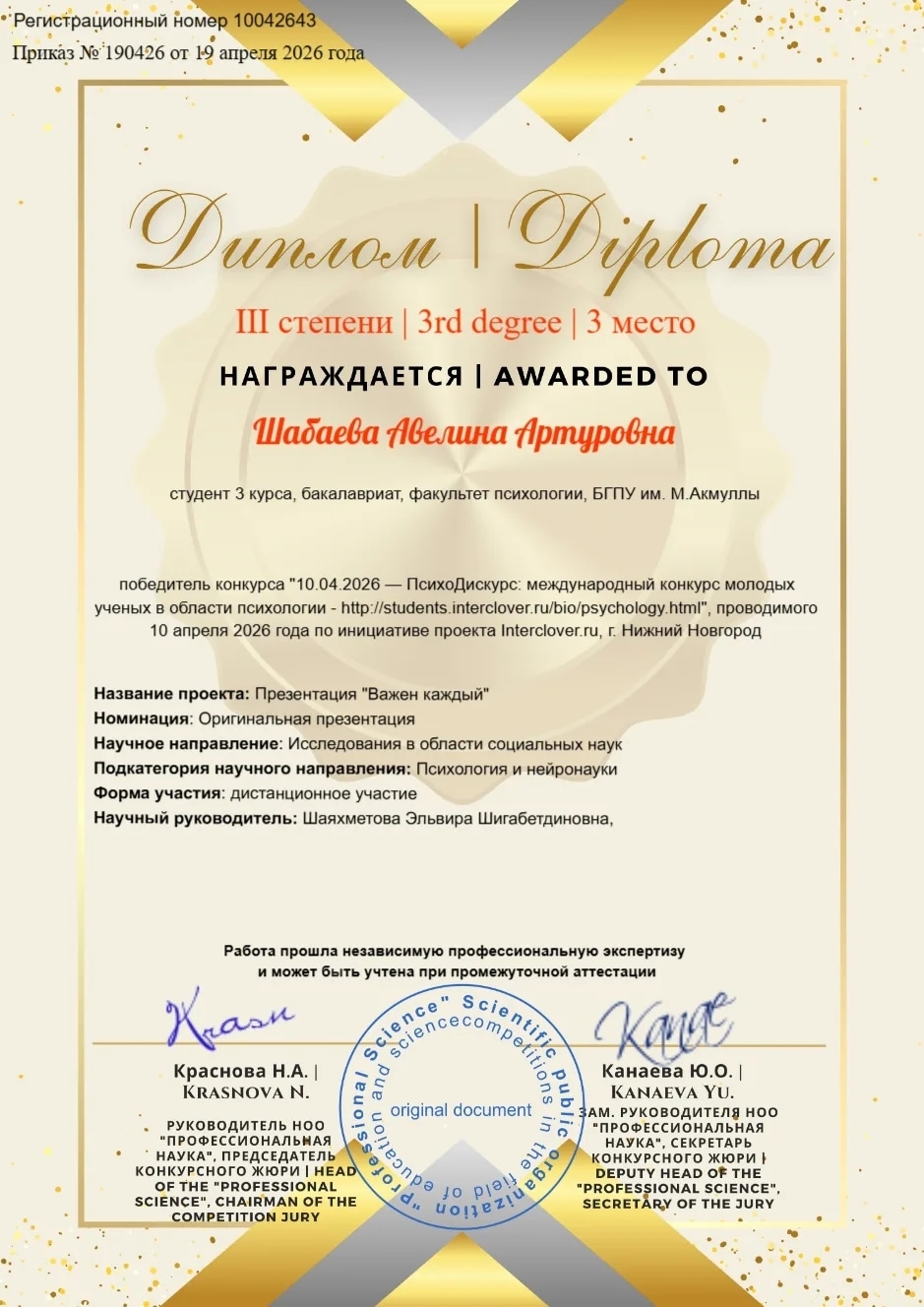 Студентка третьего курса профиль "Психологическое консультирование и медиация в социальной сфере", Авелина Артуровна Шабаева (под руководством научного руководителя профессора Эльвиры Шаяхметовой), продемонстрировала высокие результаты на международной арене. Ее видеопрезентация, посвященная социальному проекту "Благополучие пожилых людей – важен каждый", была высоко оценена экспертами. Благодаря этой работе Авелина заняла почетное третье место на международном конкурсе молодых ученых в области психологии "ПсихоДискурс 2026".