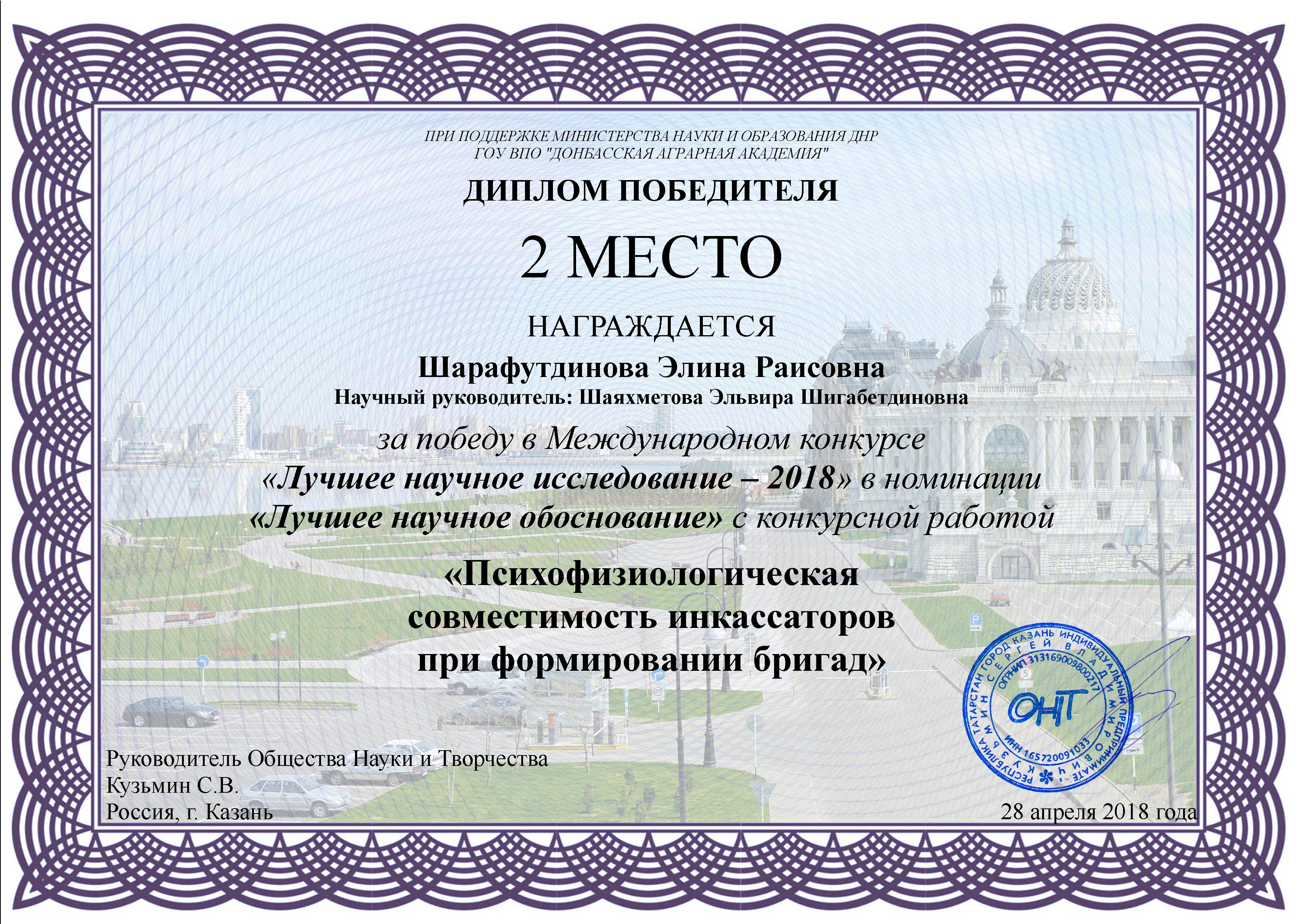 Деканат, коллектив студентов и преподавателей Факультета психологии поздравляют студентку 4 курса  направления подготовки "Психология" с профилем "Социальная психология" Элину Шарафутдинову и её научного руководителя - доктора наук, профессора кафедры общей и социальной психологии Э.Ш. Шаяхметову со 2 местом на Международном конкурсе научных работ «Лучшее научное исследование - 2018».
