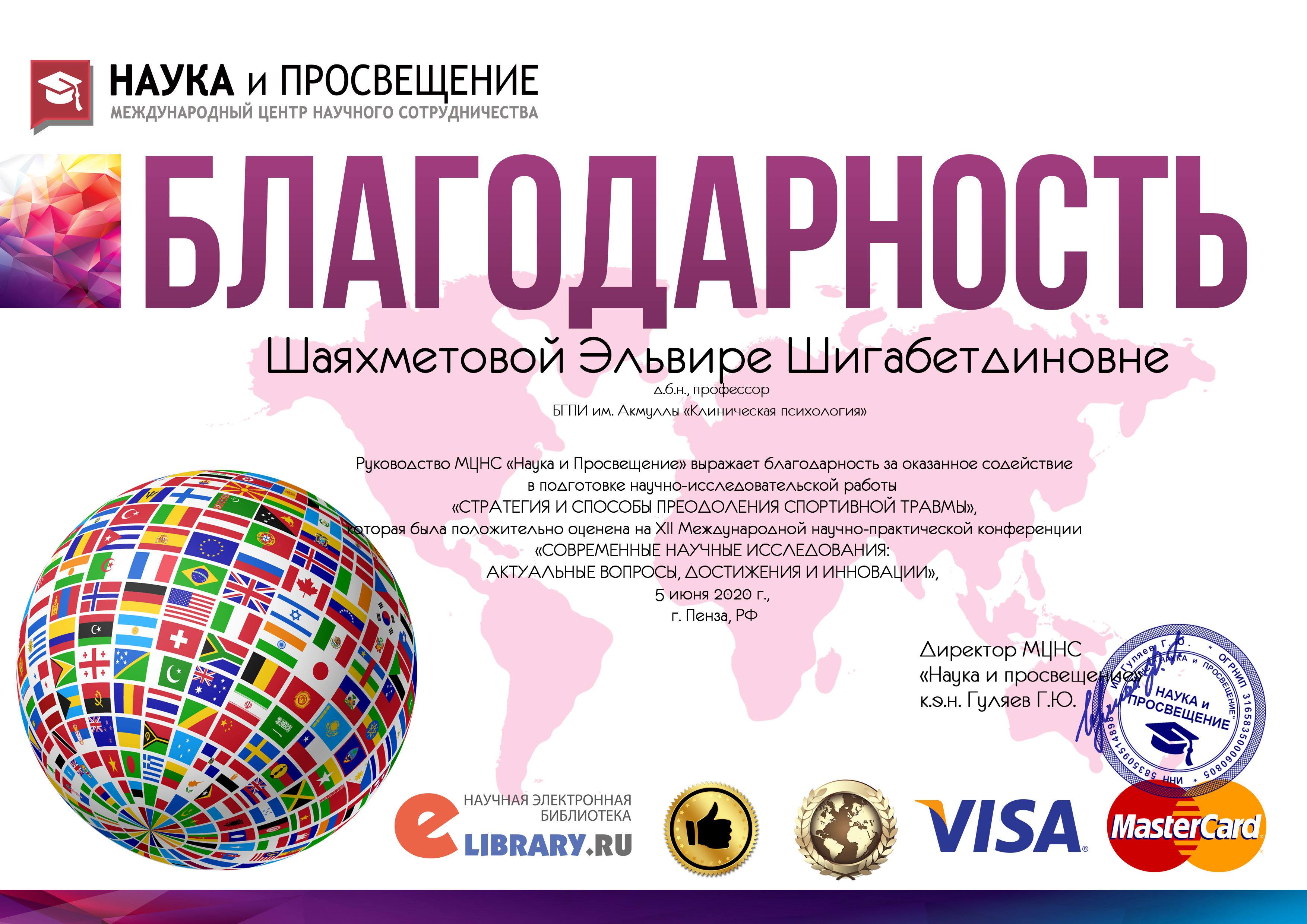 Руководство МЦНС "Наука и Просвещение" выразило благодарность  Шаяхметовой Эльвире Шигабетдиновне за оказанное содействие в подготовке научно-исследовательской работы "Стратегия и способы преодоления спортивной травмы"