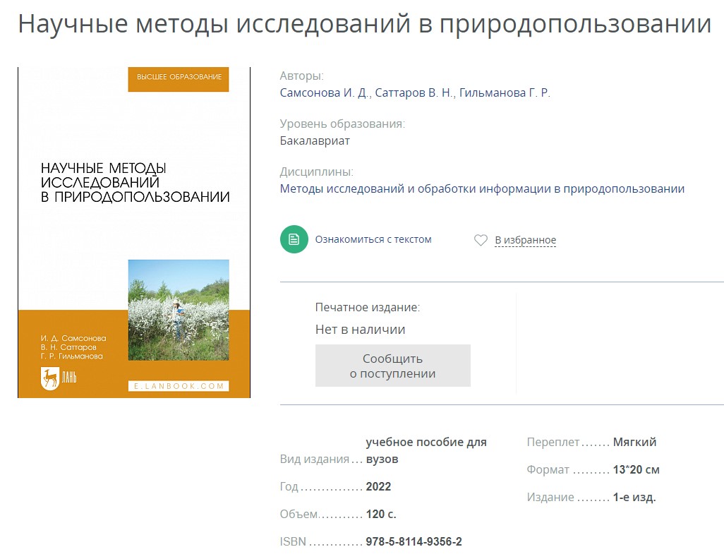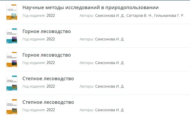 В издательства "ЛАНЬ" опубликовано учебное пособие "Научные методы исследований в природопользовании" (авторы: д.б.н., профессор Самсонова И.Д., д.б.н., профессор Саттаров В.Н., к.б.н., доцент Гильманова Г.Р.). В издании даны общие представления о научном познании, охарактеризованы основные методы исследования. Раскрываются методики изучения рекреационных объектов и растительных ресурсов в области природопользования, гидрологической роли экосистем, экологических факторов окружающей среды различной степени антропогенной нагрузки, методы эколого-фаунистического изучения насекомых, а также способы и приемы обработки информации, этапы научно-исследовательской деятельности. Рекомендуется студентам бакалавриата направления подготовки «Экология и природопользование», а также специалистам лесного и сельского хозяйства, природоохранной деятельности, экологам, научным работникам, аспирантам и студентам профильных вузов.  Издание доступно по ссылке https://lanbook.com/catalog/le.... У профессора д.б.н. Самсоновой И.Д. в 2022 году в издательстве "ЛАНЬ"  так же уже опубликованы издания "Горное лесоводство" и "Степное лесоводство" - отдельно для уровня СПО по специальности "Лесное и лесопарковое хозяйство" и для уровня бакалавриата для студентов направления "Лесное дело".