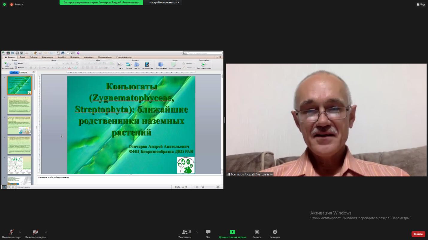 21 ноября 2022 г.  состоялся онлайн-семинар для студентов и преподавателей естественно-географического факультета на тему «Конъюгаты (Zygnematophyceae, Streptophyta): ближайшие родственники наземных растений». Его провел член-корреспондент РАН, профессор кафедры биоэкологии и биологического образования БГПУ им. М.Акмуллы, директор ФНЦ Биоразнообразия ДВО РАН Андрей Гончаров.