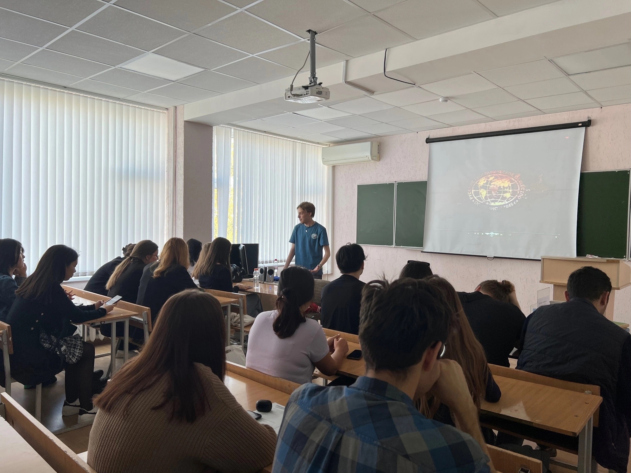 16 сентября состоялась встреча, где ведущий специалист Русского географического общества Данил Денисов провёл беседу  с первокурсниками ЕГФ о  деятельности и проектах РГО. После чего они посмотрели очень занимательный фильм про РГО. Ребятам хорошо запомнилась эта встреча, где они узнали много интересного для себя.