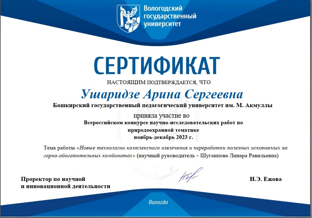 Наш университет на данном конкурсе представила студентка 3 курса - Ушаридзе Арина Сергеевна, под руководством преподавателя кафедры  - Шугаиповой Линары Равильевны. Тема научно-исследовательской работы «Новые технологии комплексного извлечения и переработки полезных ископаемых на горно-обогатительных комбинатах».