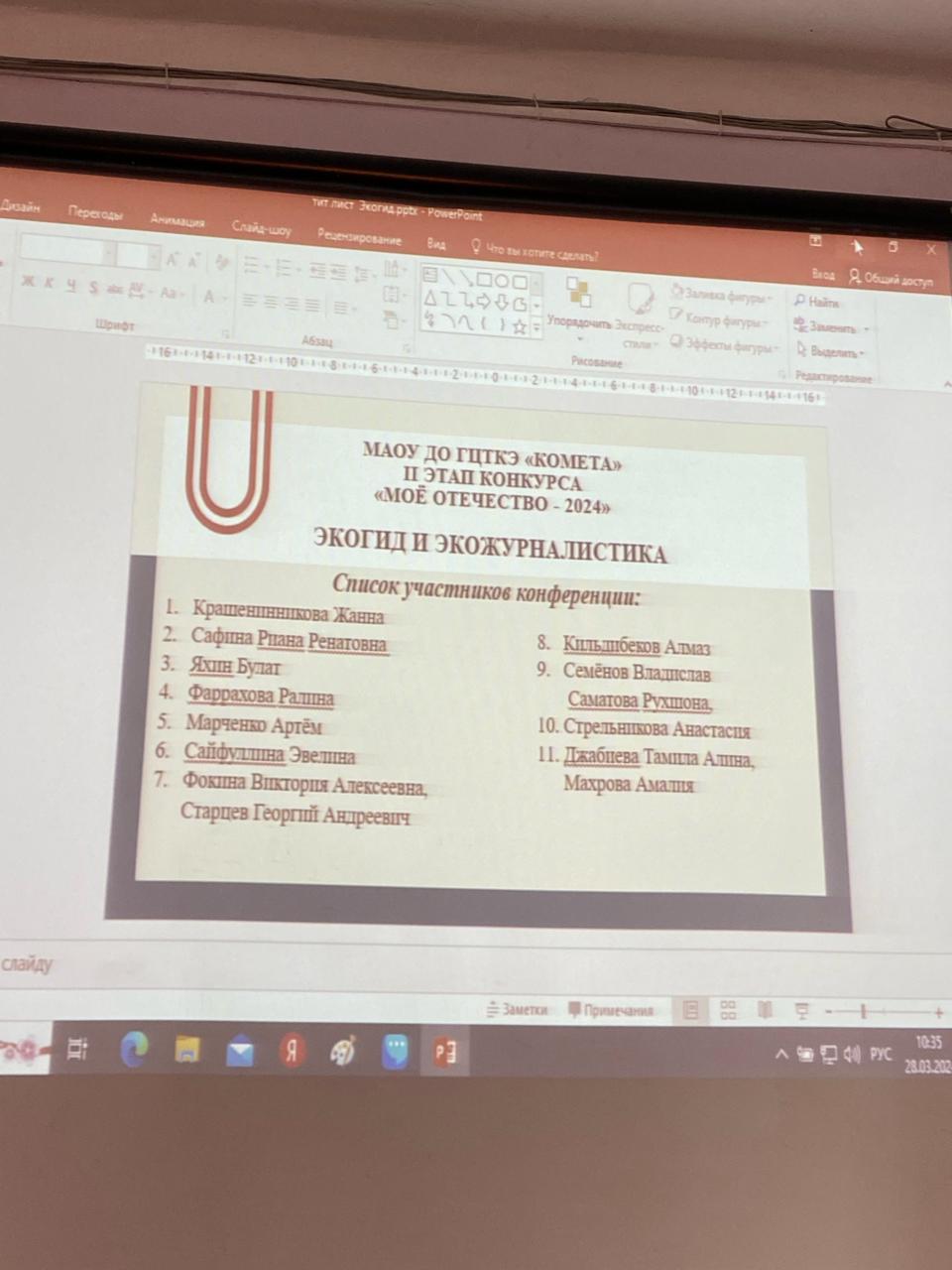 28 марта 2024 года Муниципальное автономное образовательное учреждение ДО "Городской центр туризма, краеведения и экскурсий "Комета" г. Уфа провел II очный этап городского ежегодного конкурса исследовательских краеведческих работ учащихся "Мое Отечество - 2024", среди обучающихся образовательных учреждений г. Уфа РБ.