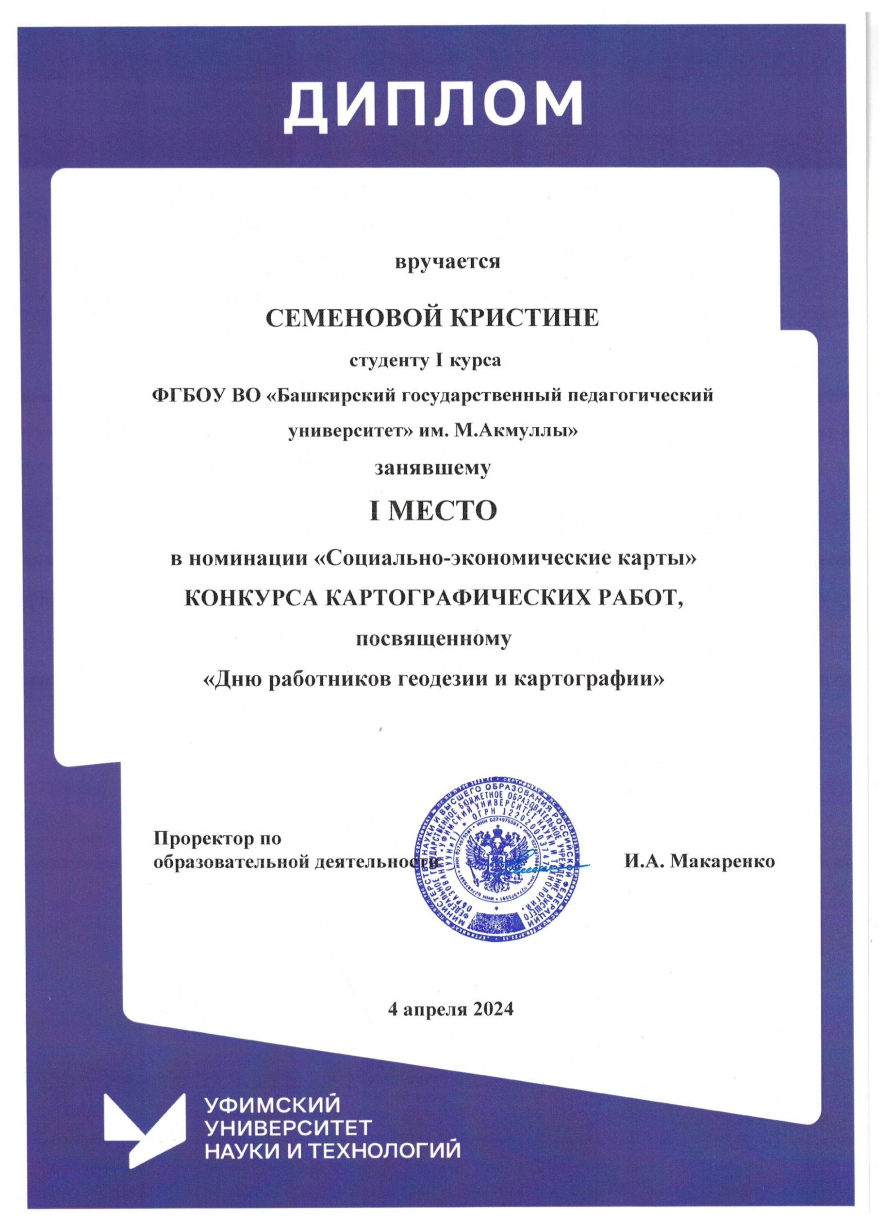 Студенты естественно-географического факультета под руководством доцента И.Р. Рахматуллиной заняли призовые места в конкурсе картографических работ (номинация "Социально-экономические карты"), проведенной Уфимским университетом науки и технологий: 1 место - Семенова Кристина, 2 место - Рашитова Азалия. В номинации «Карты экологической направленности»: 1 место – Мусина Карина, 2 место – Халитова Элина. Призерами стали студенты 1 и 2 курсов направления Педагогическое образование, профиль «География и биология» и направления Экология и природопользование, профиль «Природопользование».