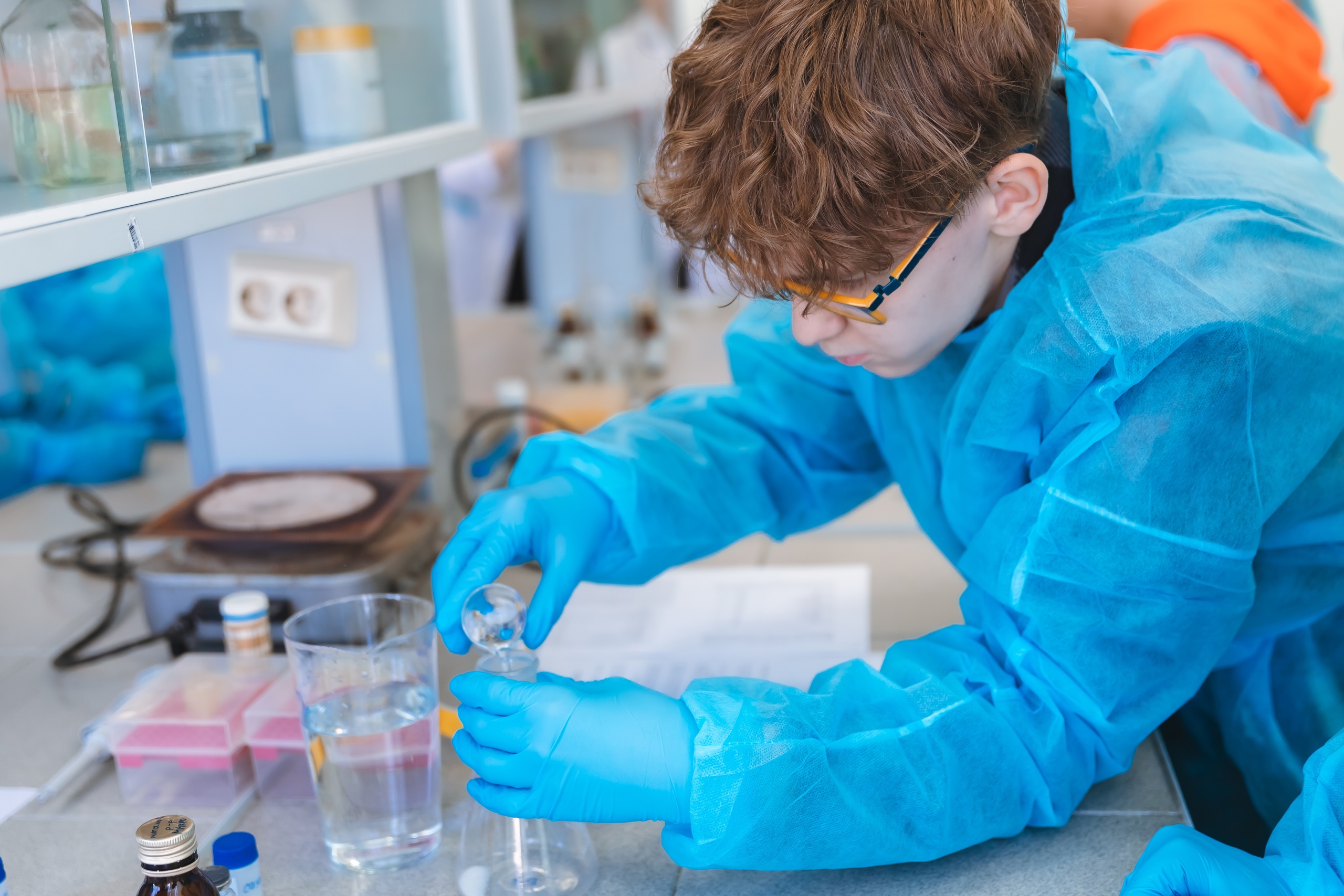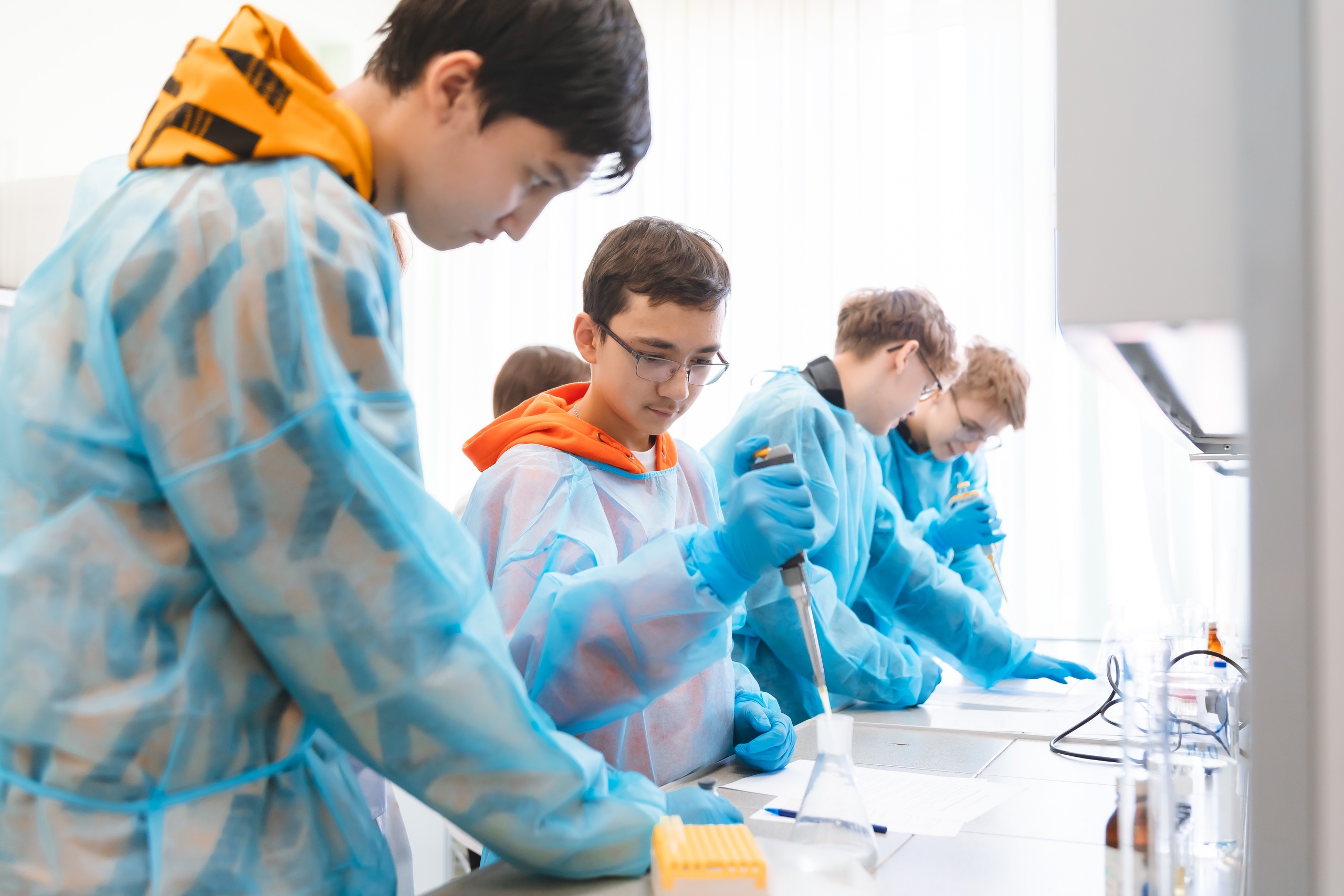 Также в этот день на естественно-географическом факультете прошли профессиональные пробы с обучающимися 9 класса Аксаковской гимназии №11 г. Уфы по профессии «Биотехнолог». Учащимся рассказали об актуальности и перспективах этого профессионального направления. Школьники познакомились с основным оборудованием биотехнологической лаборатории, с правилами работы в асептических условиях лаборатории, а также устройством ламинарного бокса. Участники проекта самостоятельно приготовили питательную среду Мурасиге-Скуга, а также провели посадку эксплантов для микроклонального размножения растений. Школьники отметили необычность и увлекательность профессии биотехнолога. Мероприятие вызвало у них живой интерес.