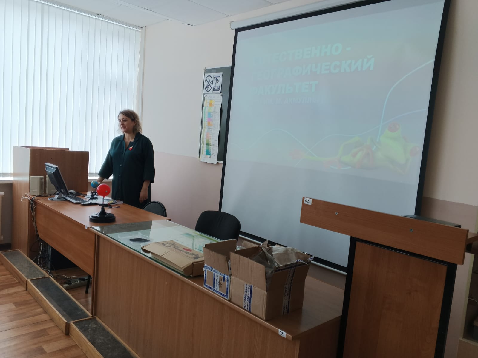 На этот раз пришли студенты обучающиеся по программе Рациональное использование природохозяйственных комплексов. и.о. декана Амина Рахматуллина, зав.кафедрой ЭГиП Венер Саттаров, доцент кафедры ГиХ Гузель Галикеева  рассказали про наш замечательный факультет, чем занимаются студенты и преподаватели на факультете, на какие направления они могут поступить к нам учится.