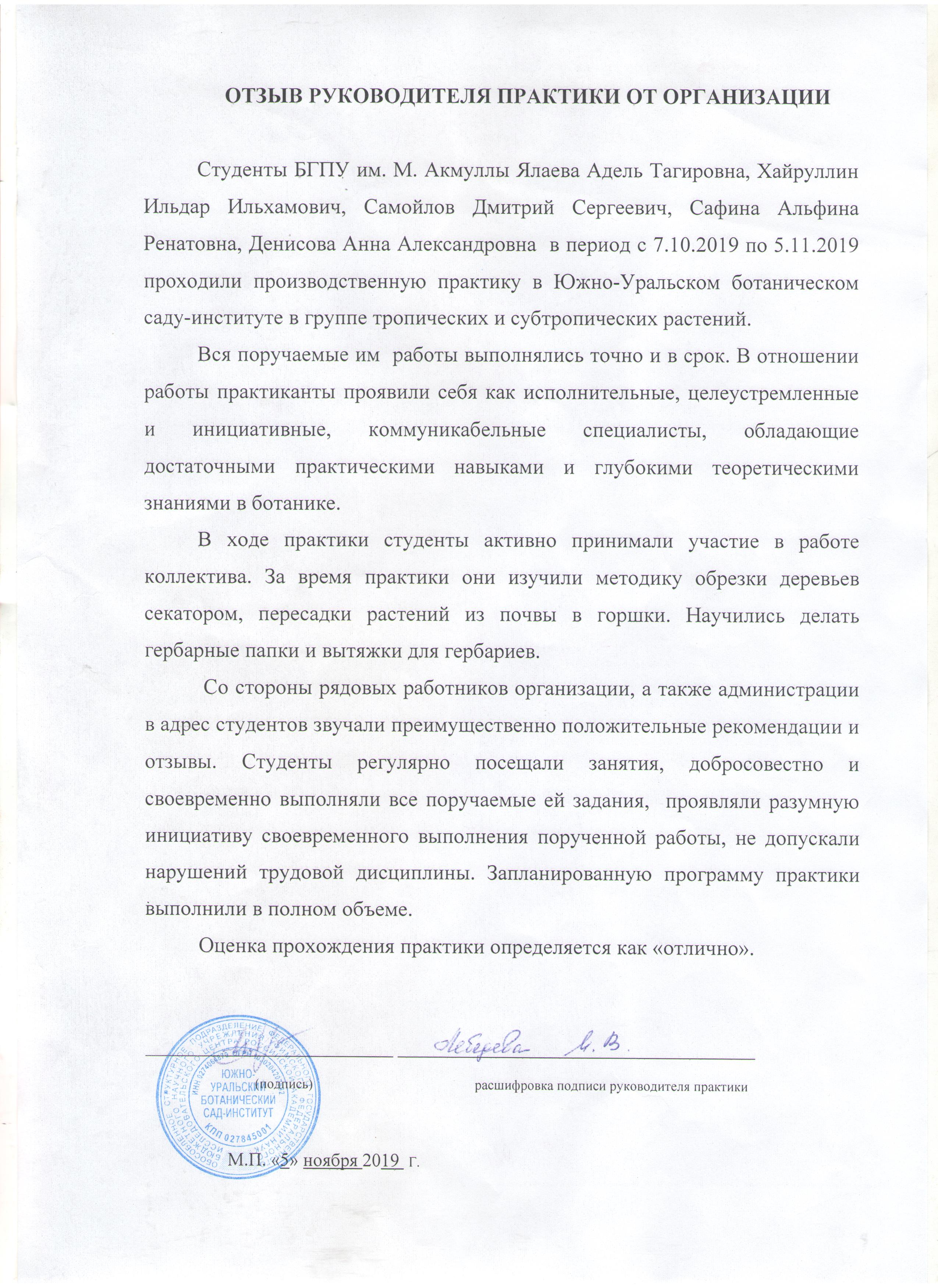 Студенты БГПУ им.М.Акмуллы в период с 7.10.2019 по 5.11.2019 прошли производственную практику в Южно-Уральском ботаническом саду-институте в группе тропических и субтропических растений. Студенты проявили себя с положительной стороны. Они отличились трудолюбием и активностью. Практиканты показали хорошие теоретические знания. Ко всем поручениям относились добросовестно, выполняли их своевременно и в срок, не допускали нарушений трудовой дисциплины. Запланированную программу практики выполнили в полном объеме.