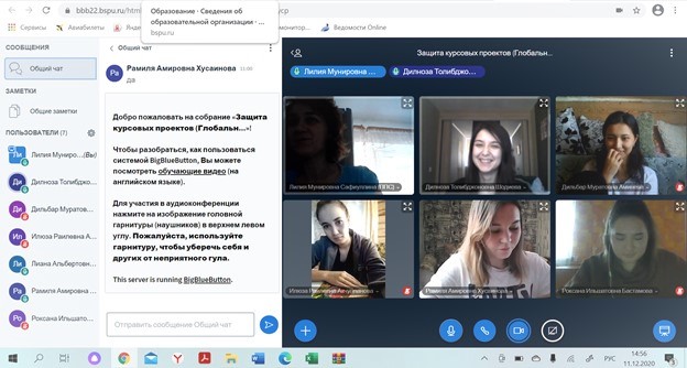 11 декабря 2020 года на кафедре биоэкологии и биологического образования в онлайн формате на платформе ЛМС успешно прошла защита курсовых работ по дисциплине «Наука о растительности» у бакалавров 3 курса направления 06.03.01 «Биология», профиль «Биоэкологи»". Руководителем курсовых работ является кандидат биологических наук, доцент Сафиуллина Лилия Мунировна.