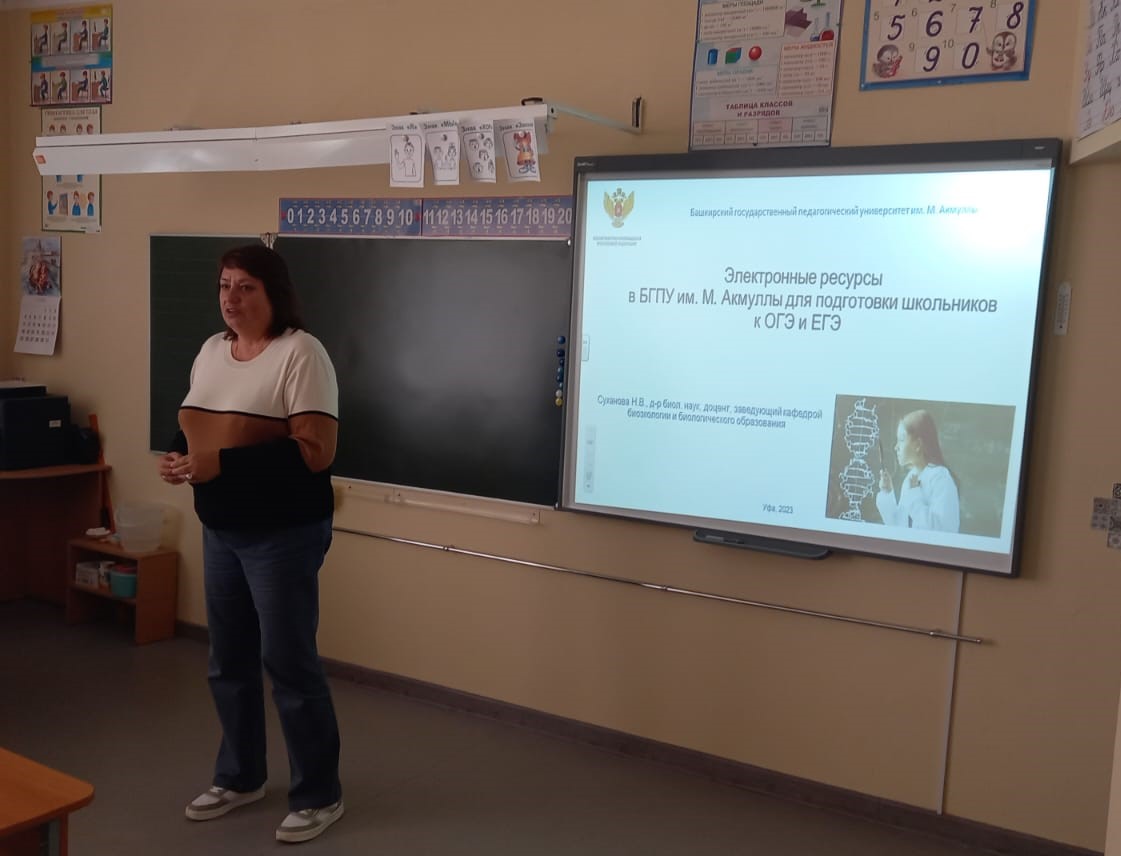 21 сентября 2023 г. на базе МАОУ "Лицей "содружество"" состоялись предметные секции в рамках августовского совещания работников образования Орджоникидзевского района городского округа город Уфа на тему "Анализ результатов процедур оценки качества образования: перспективы развития".  Спикером секции биологии выступила заведующая кафедрой биоэкологии и биологического образования, доктор биологических наук Наталья Суханова с докладом на тему "Контрольно-измерительные материалы по биологии: изменения". В своем докладе Наталья Викторовна дала анализ изменениям, произошедшим в  контрольно-измерительных материалах по биологии, о сложностях ЕГЭ по биологии в 2023 году. Более подробно остановилась на  электронных ресурсах, разработанных в БГПУ им. М.Акмуллы в помощь школьникам для подготовки к ЕГЭ по разделам биологии.