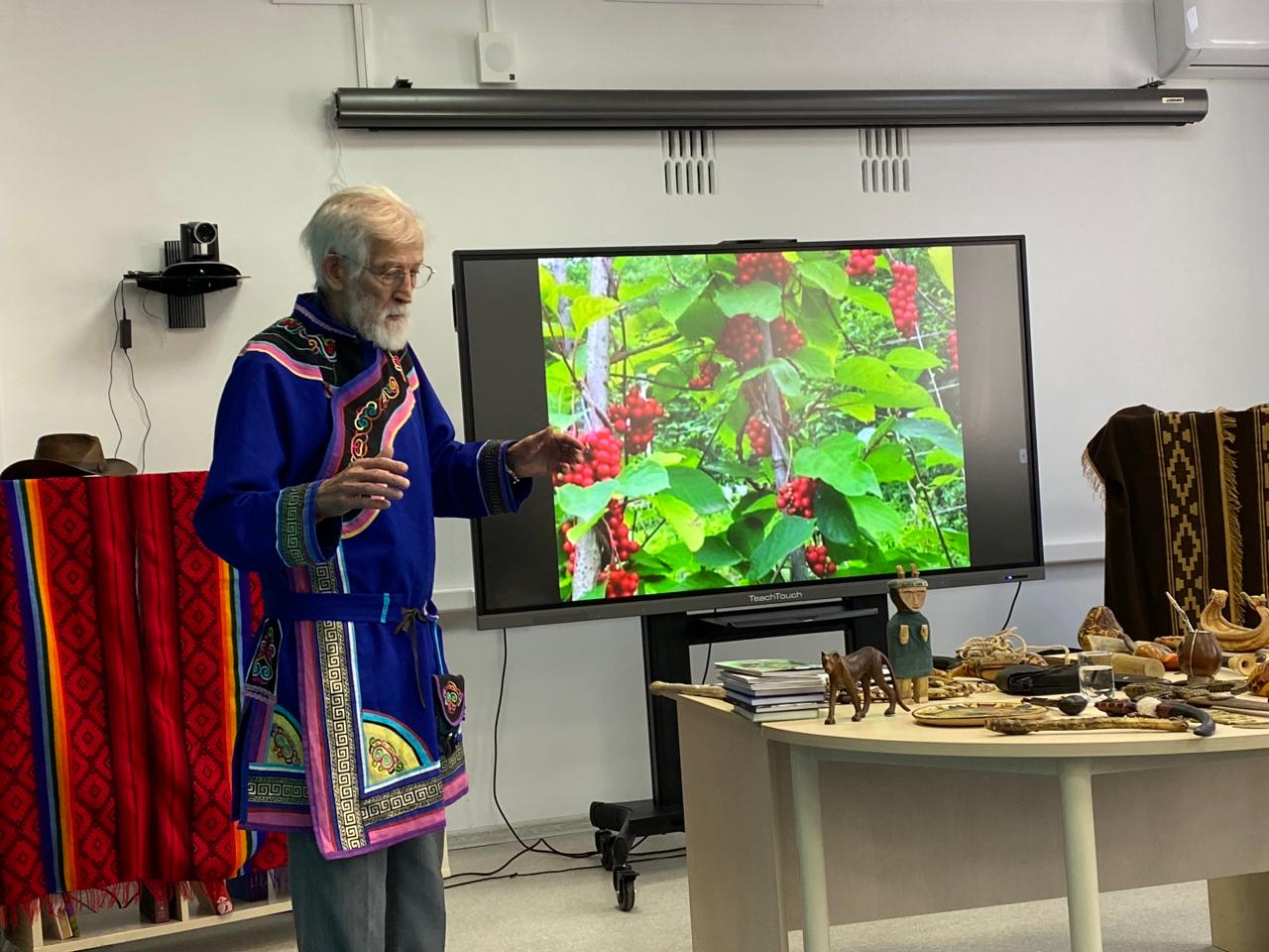 Гость рассказал о своем жизненном пути, становлении и развитии как прозаика и писателя-натуралиста, достижениях и творческих планах, впечатлениях от поездок по стране и миру. Рассказ ученого-путешественника сопровождался показом настоящих предметов быта, амулетов, а также элементов одежды представителей народов тех стран, в которых ему удалось побывать. Были представлены книги о животных — «Маха», «Щедрый Буге», «Боцман», «Скитники» и др.