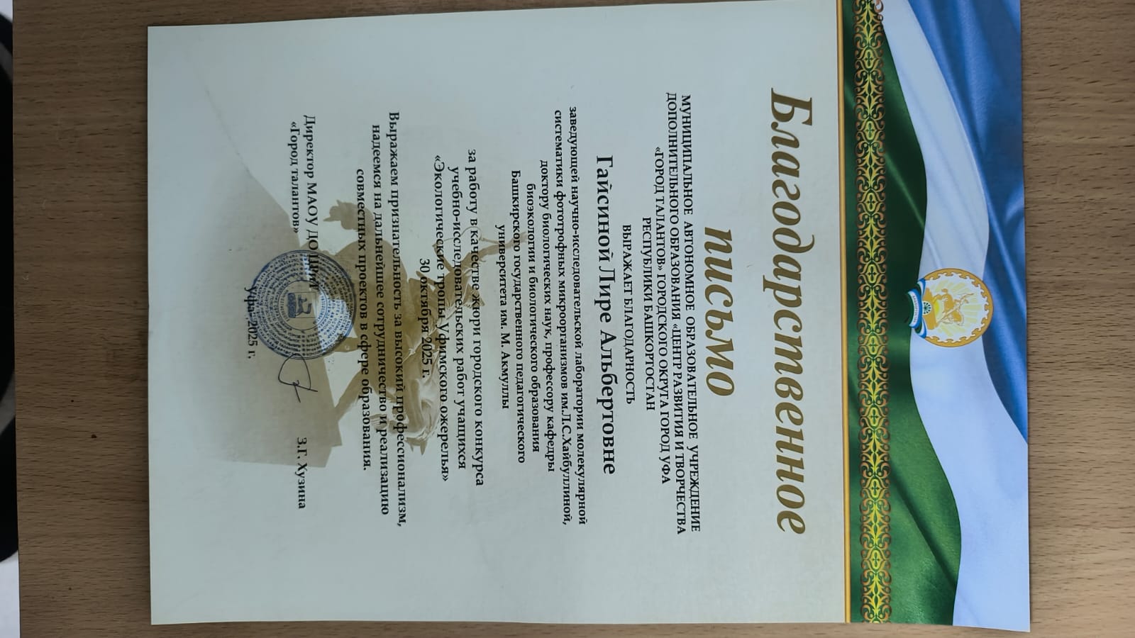30 октября в г. Уфа состоялась очная  конференция городского экологического конкурса «Экологические тропы Уфимского ожерелья» среди обучающихся образовательных организаций городского округа город Уфа Республики Башкортостан. Заведующая научно-исследовательской лаборатории молекулярной систематики фототрофных микроорганизмов им. Л. С. Хайбуллиной Лира Альбертовна Гайсина, руководитель молодежного научного  объединения «Альгологических клуб» Илья Ван  Эрп  а также студент Института природы и человека УУНиТ,  директор  ООО «АльгоЛамп» Алмаз Махмутов,  выступили в роли экспертов и оценивали исследовательские работы конкурсантов. Ребята разного возраста представили результаты своих исследований, получили рекомендации от ученых для продолжения своих работ, а также обсудили современные проблемы изучения биоразнообразия на  территории Республики Башкортостан.