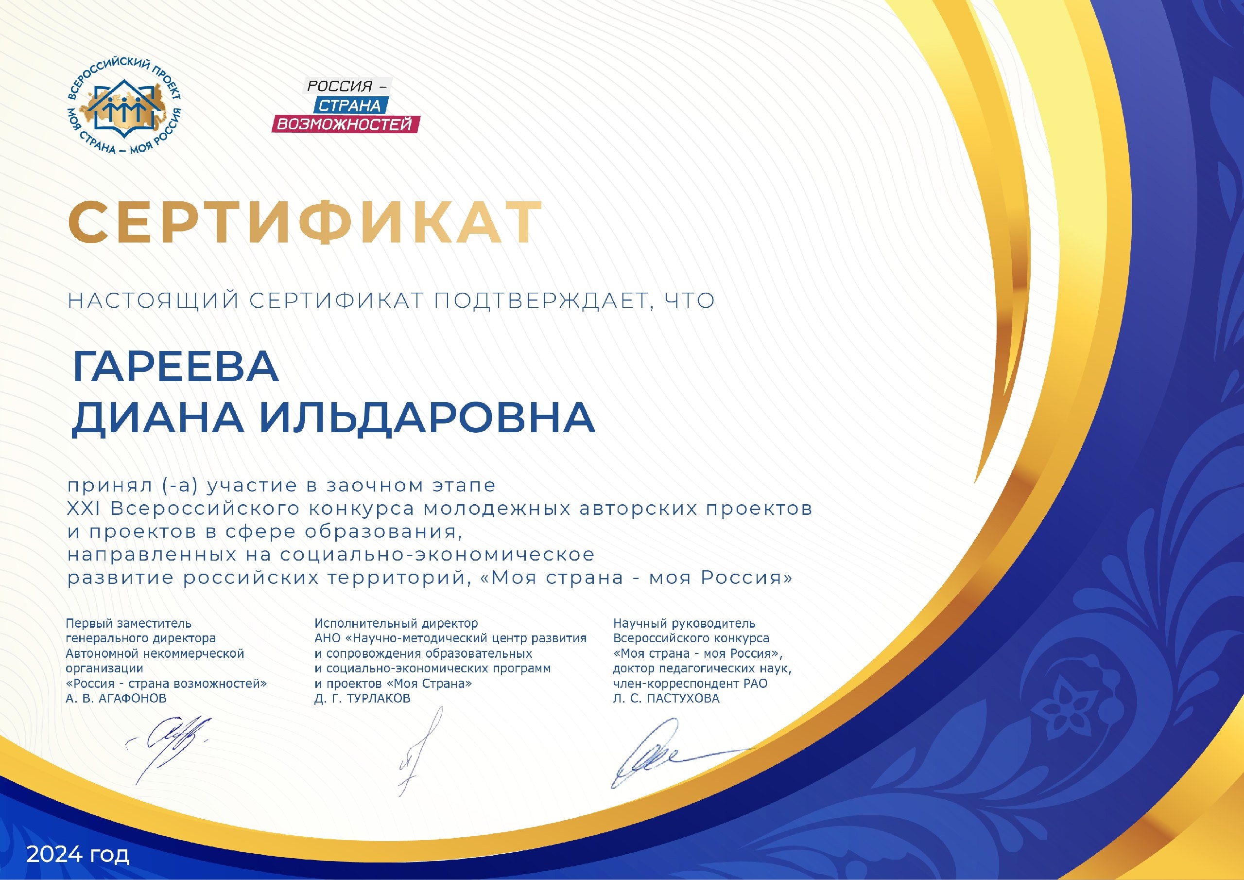 В числе участников заочного этапа конкурса была магистр 2-го курса Гареева Диана Ильдаровна. Она представила свой проект и успешно получила сертификат об участии, что подчеркивает ее активное участие в образовательных инициативах.