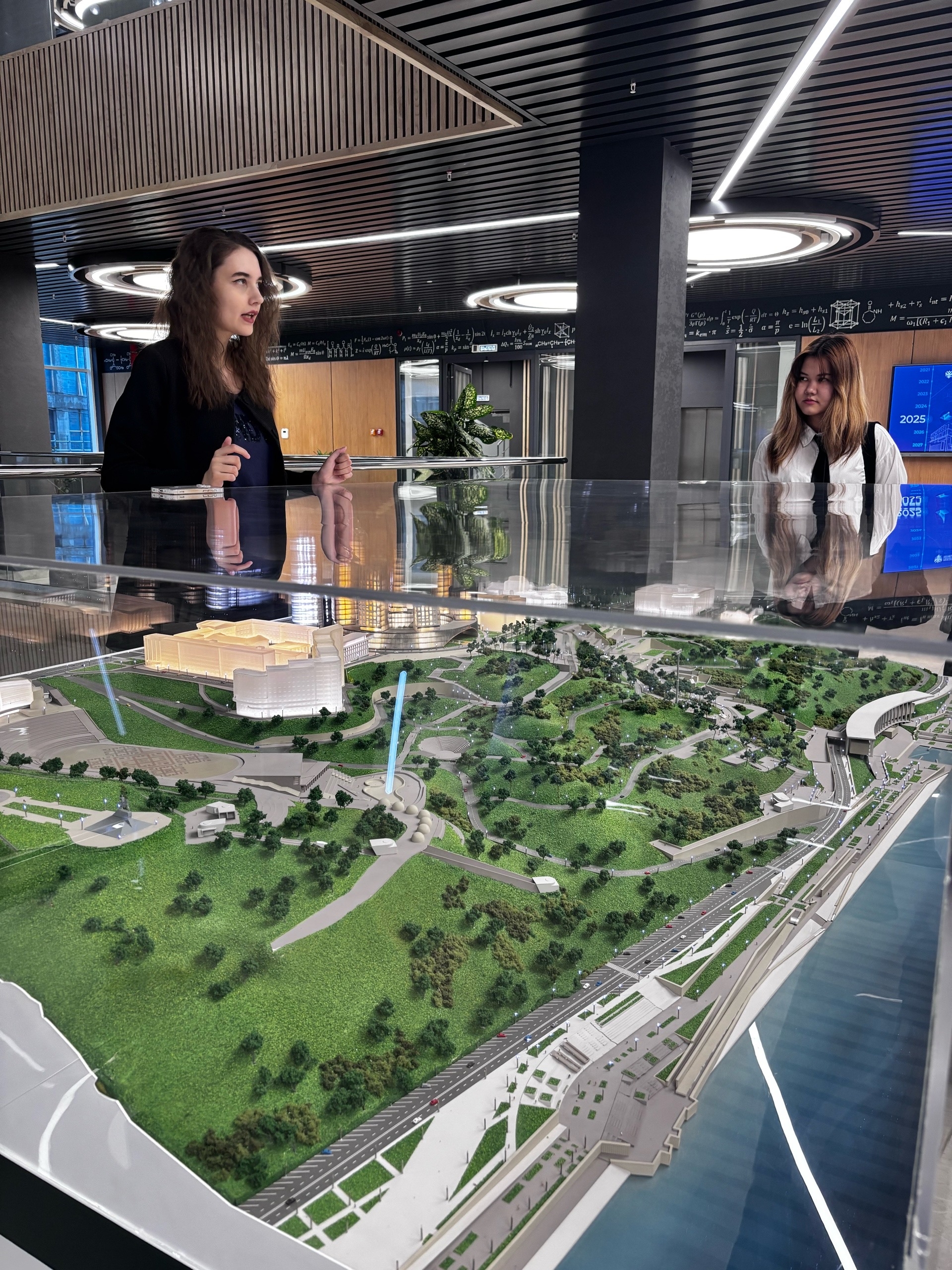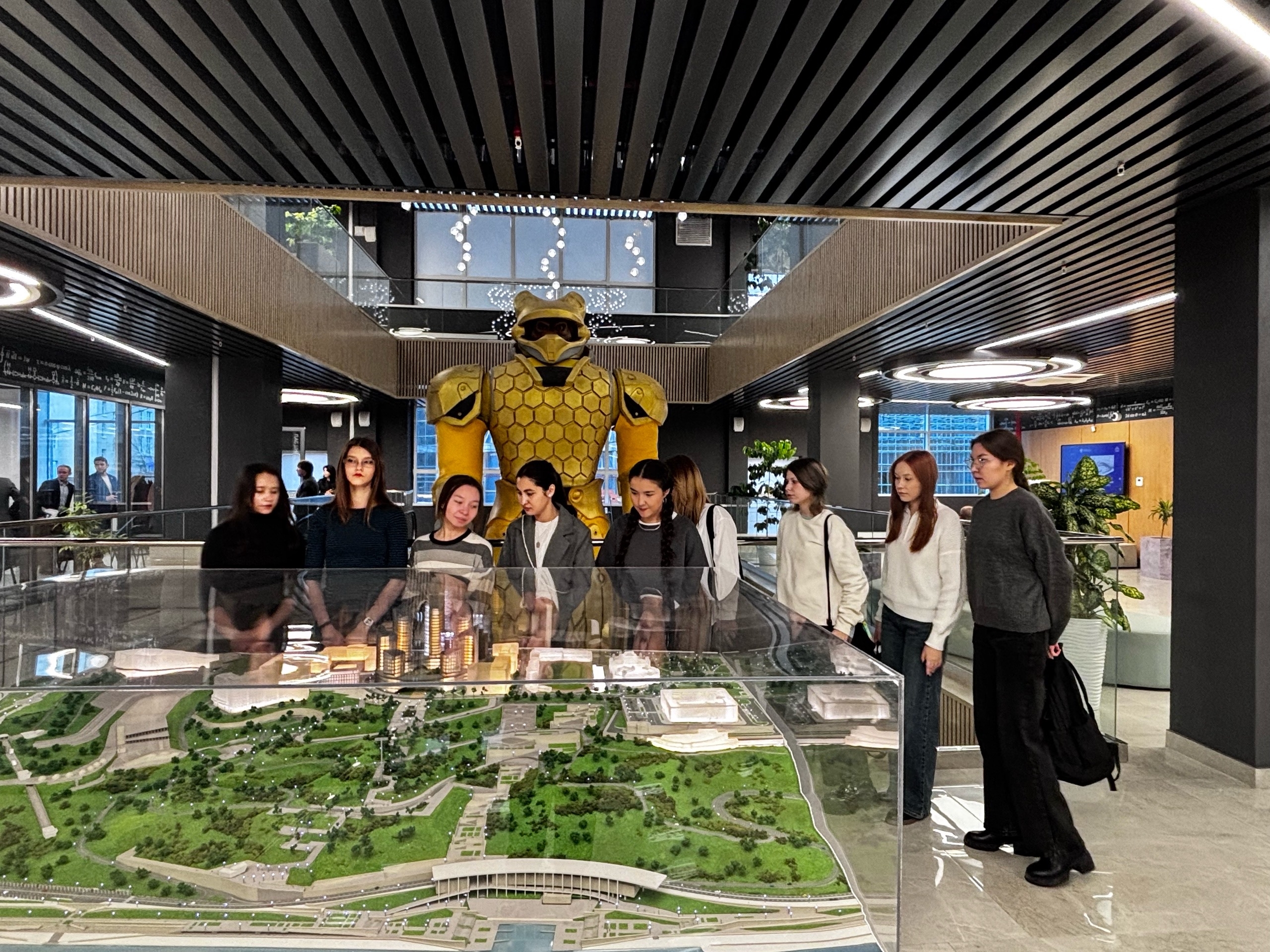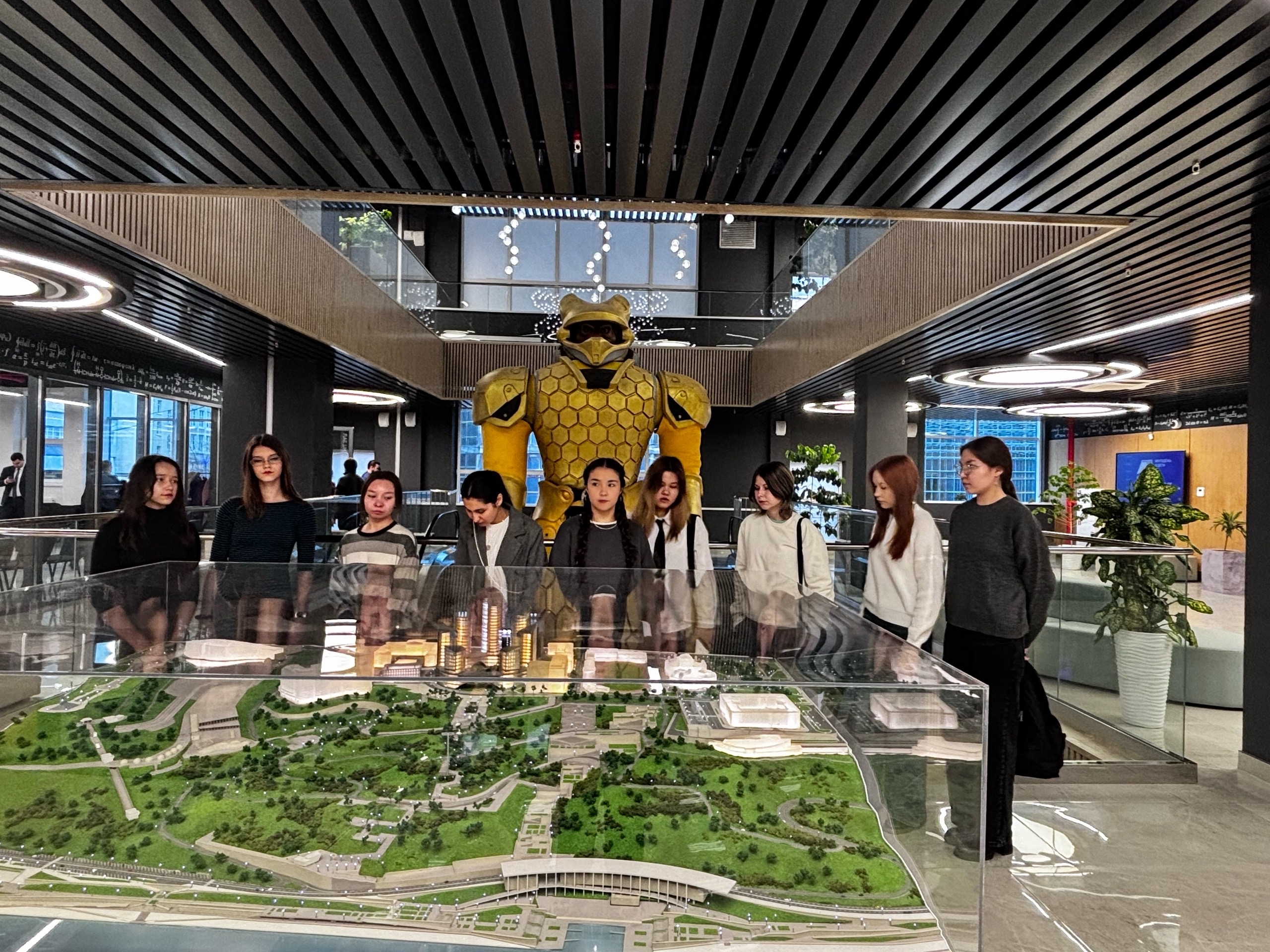 Гостей сразу поразила уникальная статуя робота-медведя – символ инноваций, сочетающий силу природы и высокие технологии. Затем экскурсовод представила амбициозные планы по развитию кампуса: детальный макет центральной части Уфы за стеклом позволил "прогуляться" по будущим корпусам и паркам города. В самом кампусе каждая деталь интерьера – от декоративных элементов до мебели – несет отпечаток науки: формулы ДНК на стенах, молекулярные модели в декоре и даже лампы в форме спирали генома.