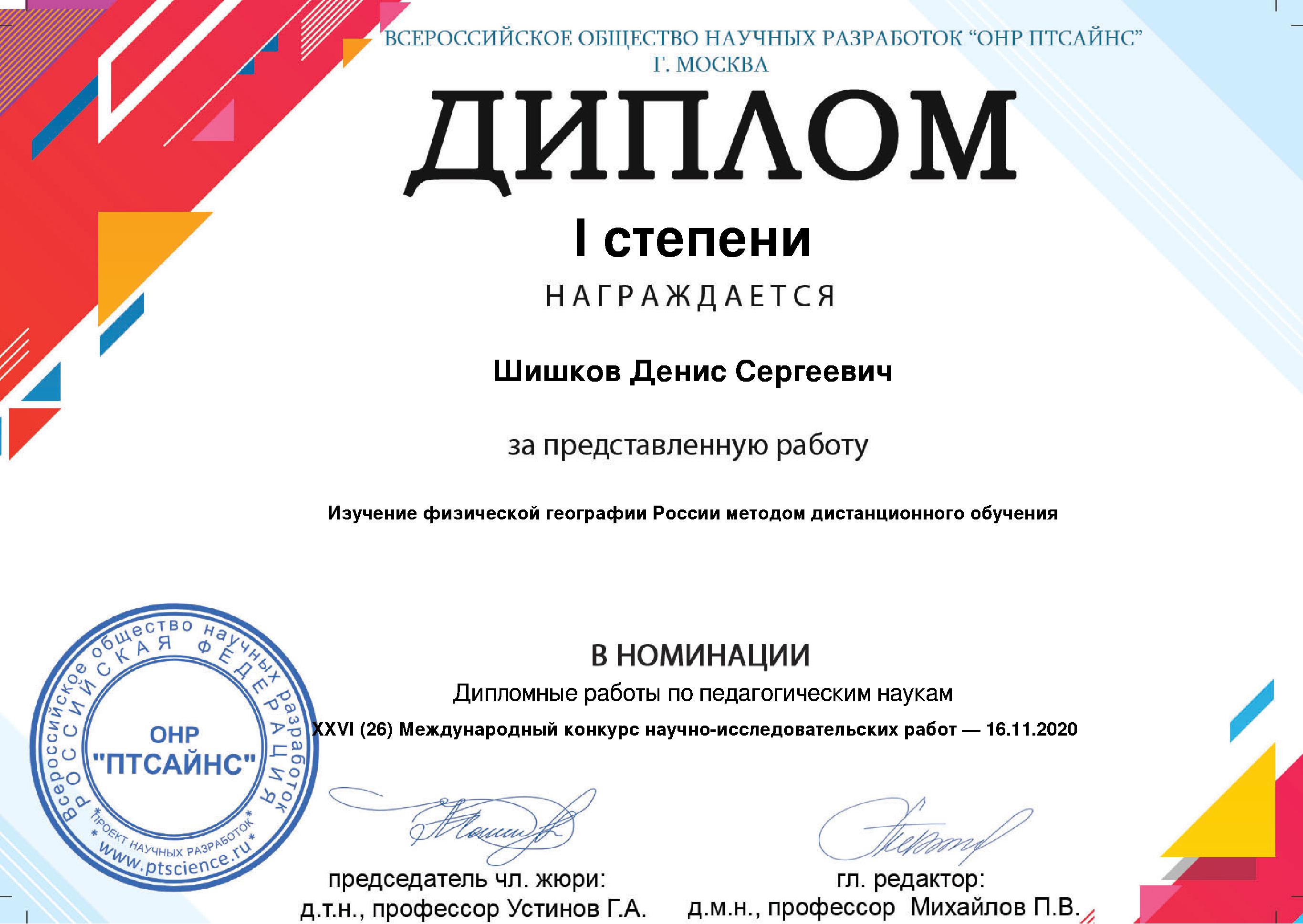Поздравляем магистра 1 курса профиля «Географическое образование» Шишкова Дениса и его руководителя доц. Латыпову З.Б. с получением Диплома 1 степени в Международном конкурсе научно-исследовательских работ в номинации «Дипломные работы по педагогическим наукам».