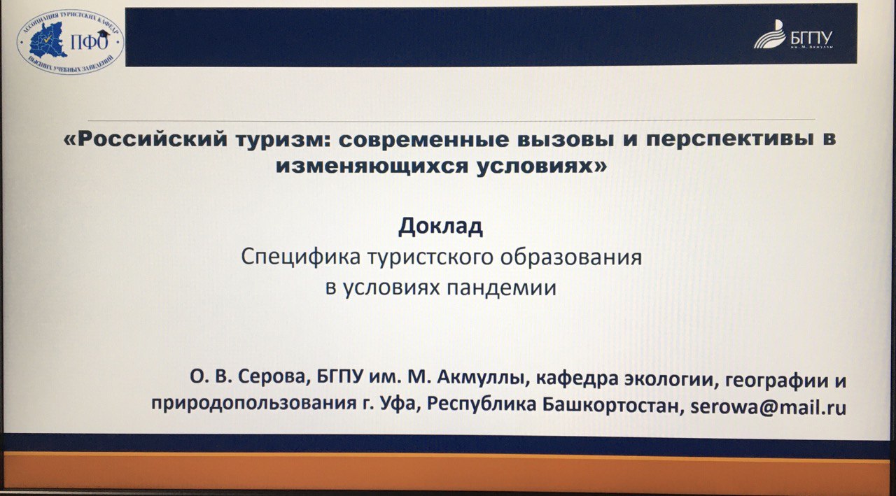 В Российской международной академии туризма 05 октября 2021 года прошла XVI Международная научно-практическая конференция «ТУРИЗМ И РЕКРЕАЦИЯ: фундаментальные и прикладные исследования» (Россия, г. Химки). В работе секции №2 «Образование и подготовка кадров для рекреации и туризма в условиях пандемии и пост пандемии» приняли участие 23 докладчика, были заслушаны и обсуждены доклады коллег из МГУ им. М.В. Ломоносова, РМАТ, Российского государственного аграрного университета - им. К.А. Тимирязева, Казанского национального исследовательского технологического университета. Работы были посвящены опыту развития культурно-познавательного, круизного, сельского видов туризма, установлению межкоммуникационных связей с применением современного программного обеспечения. С докладом об адаптации учебного процесса в условиях пандемии выступила доцент кафедры экологии географии и природопользования Оксана Васильевна Серова.