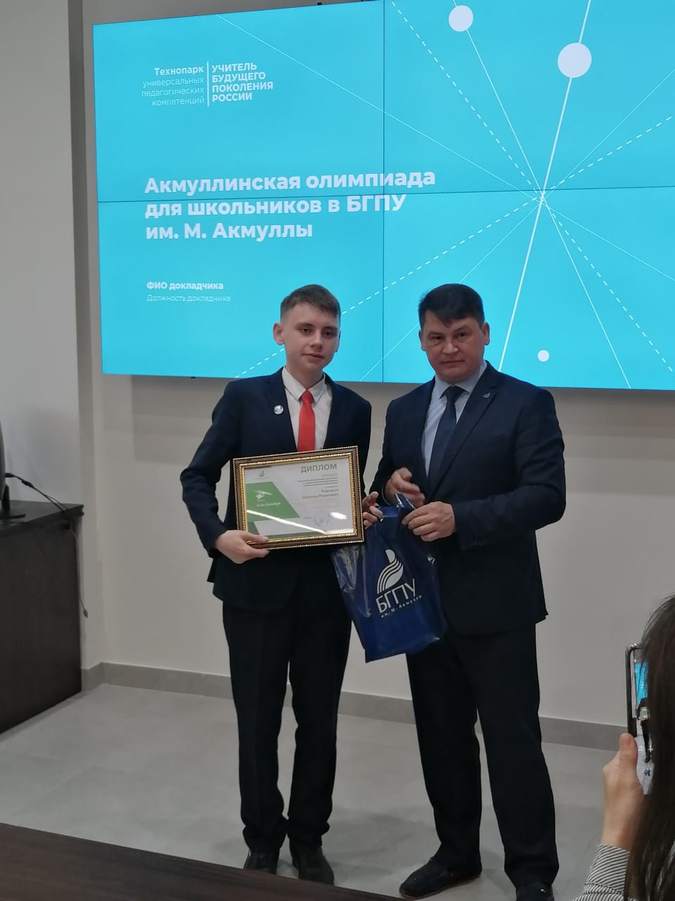 Из победителей и призеров Акмуллинской олимпиады по географии смогли посетить университет Шамиль Кадыров и Ильназ Галлямов. Торжественное вручение дипломов участникам олимпиады провел проректор по воспитательной, социальной и образовательной политике БГПУ им.М.Акмуллы Винер Шаяхметов. Для участников церемонии и их родителей также прошли мастер-классы от преподавателей и студентов вуза, презентации направлений, реализуемых в Университете, экскурсия по технопарку и по профильным факультетам и институтам.