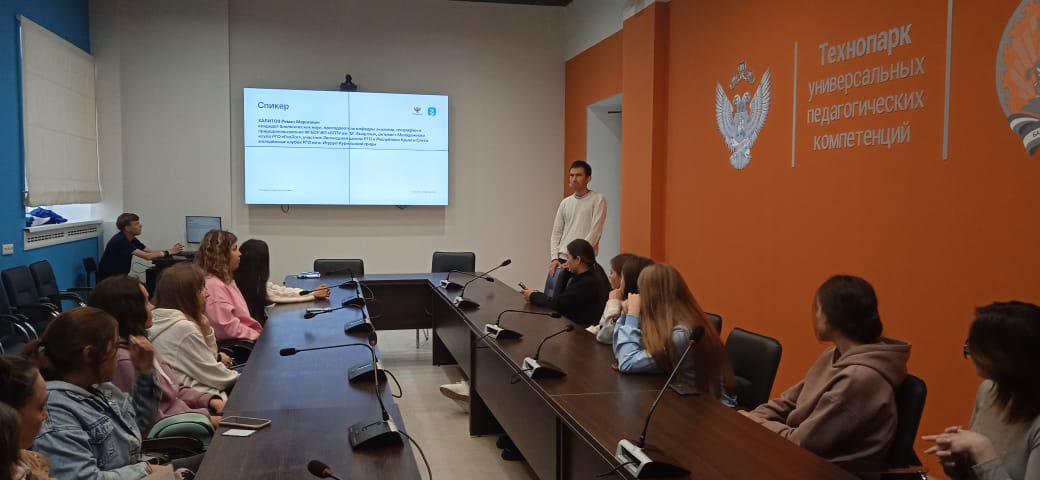 В рамках Всероссийской просветительской акции "Поделись своим знанием" преподаватель кафедры экологии, географии и природопользования кандидат биологических наук Роман Халитов рассказал первокурсникам естественно-географического факультета о своем опыте участия в летних Молодежных слётах, организованных Русским географическим обществом в 2022 году.  В июле месяце его заявка получила подтверждение на участие в проекте "Заповедное дело РГО" в Никитском ботаническом саду Крыма, а в августе он стал одним из 20 участников, приглашенных со всей России, экспедиционного слета молодежных клубов РГО на острове Итуруп (Сахалинская область). Что входило в программу слетов, что удалось посмотреть, изучить, какой научный вклад внести в развитие этих уникальных территорий - об этом прошла беседа с ребятами, выбравшими своей профессией работу географа и эколога.