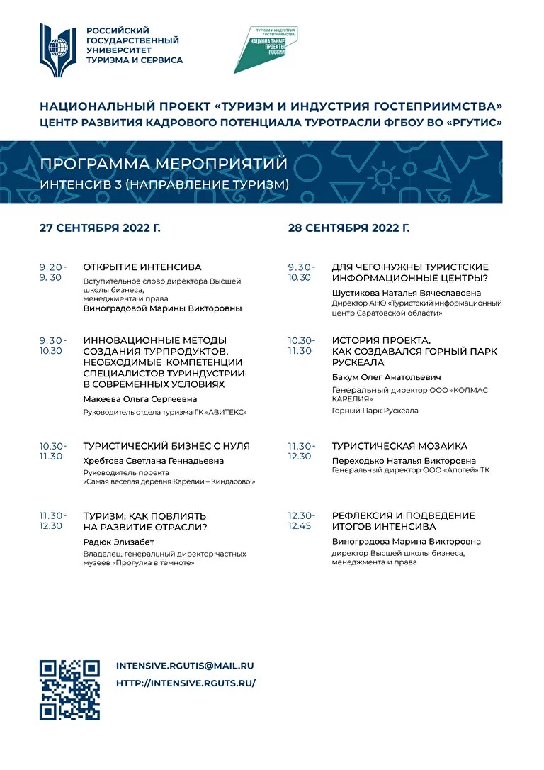 Студенты направления Туризм 3 курс в рамках образовательной деятельности приняли участие в онлайн-мероприятии «Интенсив РГУТИС!». Это был Третий интенсив в рамках Национального проекта «Туризм и индустрия гостеприимства» от Центра развития кадрового потенциала туротрасли ФГБОУ ВО «РГУТИС» г. Москва, организованный 27-28 сентября 2022 г. Наибольший интерес вызвали лекции на тему «Инновационные методы создания турпродуктов. Необходимые компетенции специалистов туриндустрии в современных условиях» от Макеевой Ольги Сергеевны (рук. отд. туризма  ГК «АВИТЕКС») и «Для чего нужны ТИЦ?» от Шустиковой Натальи (директор АНО ТИЦ Саратовской области). Полученные знания пригодятся студентам в практической деятельности.