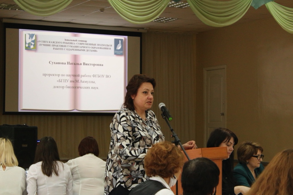 7 апреля 2021 года в г. Туймазы на базе СОШ №7 прошел Зональный семинар для учителей гуманитарных дисциплин по теме: «Успех каждого ребенка: современные подходы и лучшие практики гуманитарного образование в работе с одаренными детьми». Инициатором и организатором выступили Институт исторического, правового и социально-гуманитарного образования БГПУ им. М. Акмуллы и администрация СОШ №7 г. Туймазы. В мероприятии приняли участие более 80 учителей-предметников гуманитарного цикла (истории, права, обществознания, экономики и мировой художественной культуры), методистов отделов образования западного региона Башкортостана (Октябрьского, Ермекеевского, Шаранского, Давлекановского, Буздякского, Благоварского, Чекмагушевского, Белебеевского и Туймазинского районов).