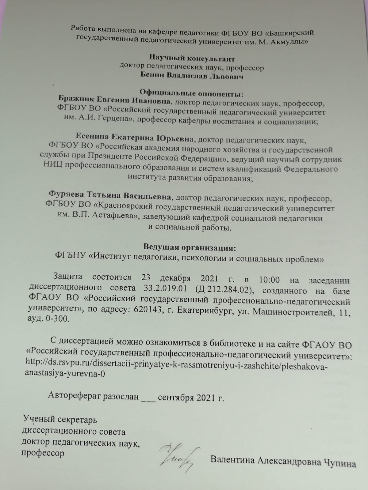 23 декабря 2021 г. в диссертационном совета Российского государственного профессионально-педагогического университета состоялась успешная защита диссертации на соискание ученой степени доктора педагогических наук Анастасии Юрьевны Плешаковой на тему "Педагогическая компаративистика идентичности профессионального образования: методология, теория, практика". Работа выполнена в докторантуре БГПУ им. М. Акмуллы. Научный консультант д.п.н., профессор Владислав Львович Бенин.