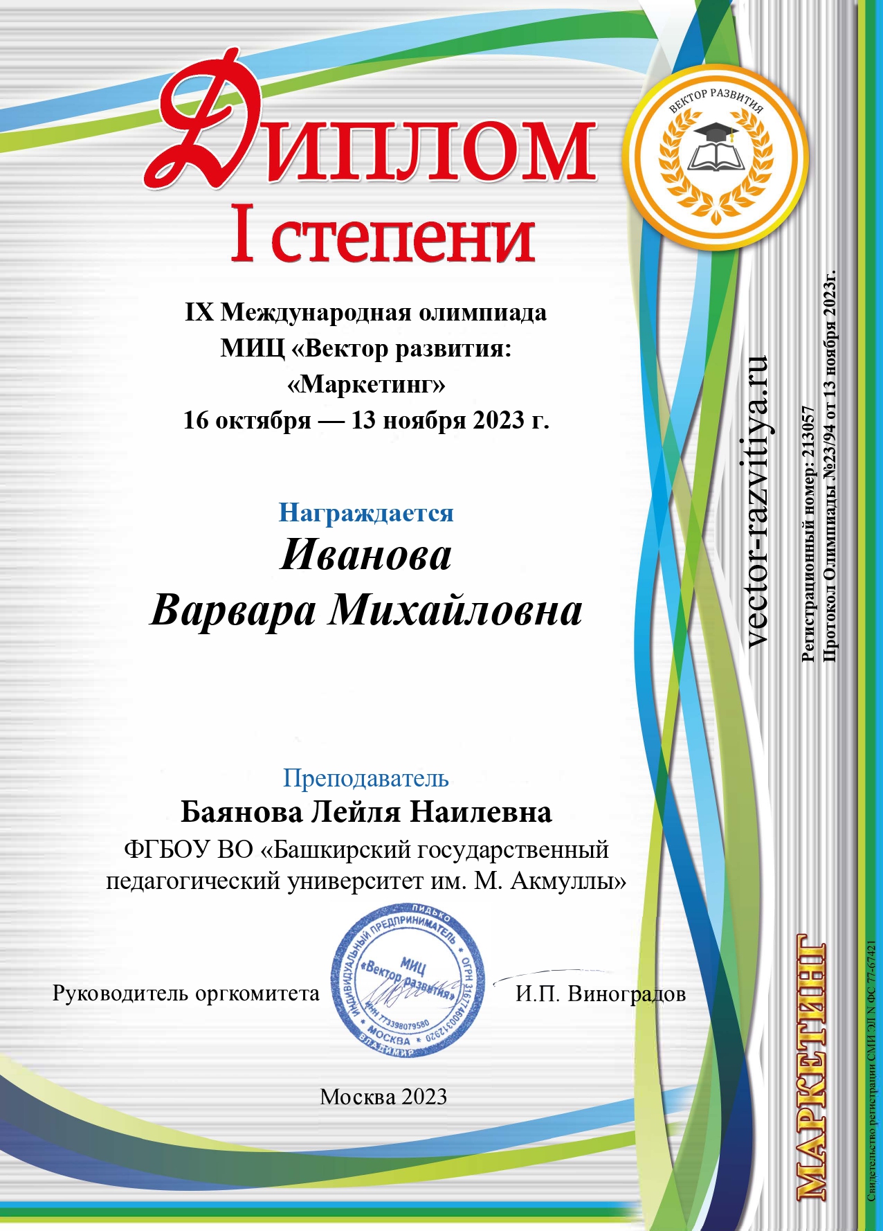 С 16 октября по 13 ноября 2023 года прошла IX Международная олимпиада МИЦ Вектор развития: «Маркетинг». В ней приняли участие члены студенческого клуба «Экономический капустник» – студенты 4 и 5 курса профиля «Мировая художественная культура и экономика» под руководством доцента кафедры культурологии и социально – экономических дисциплин Баяновой Л.Н. и показали следующие результаты: