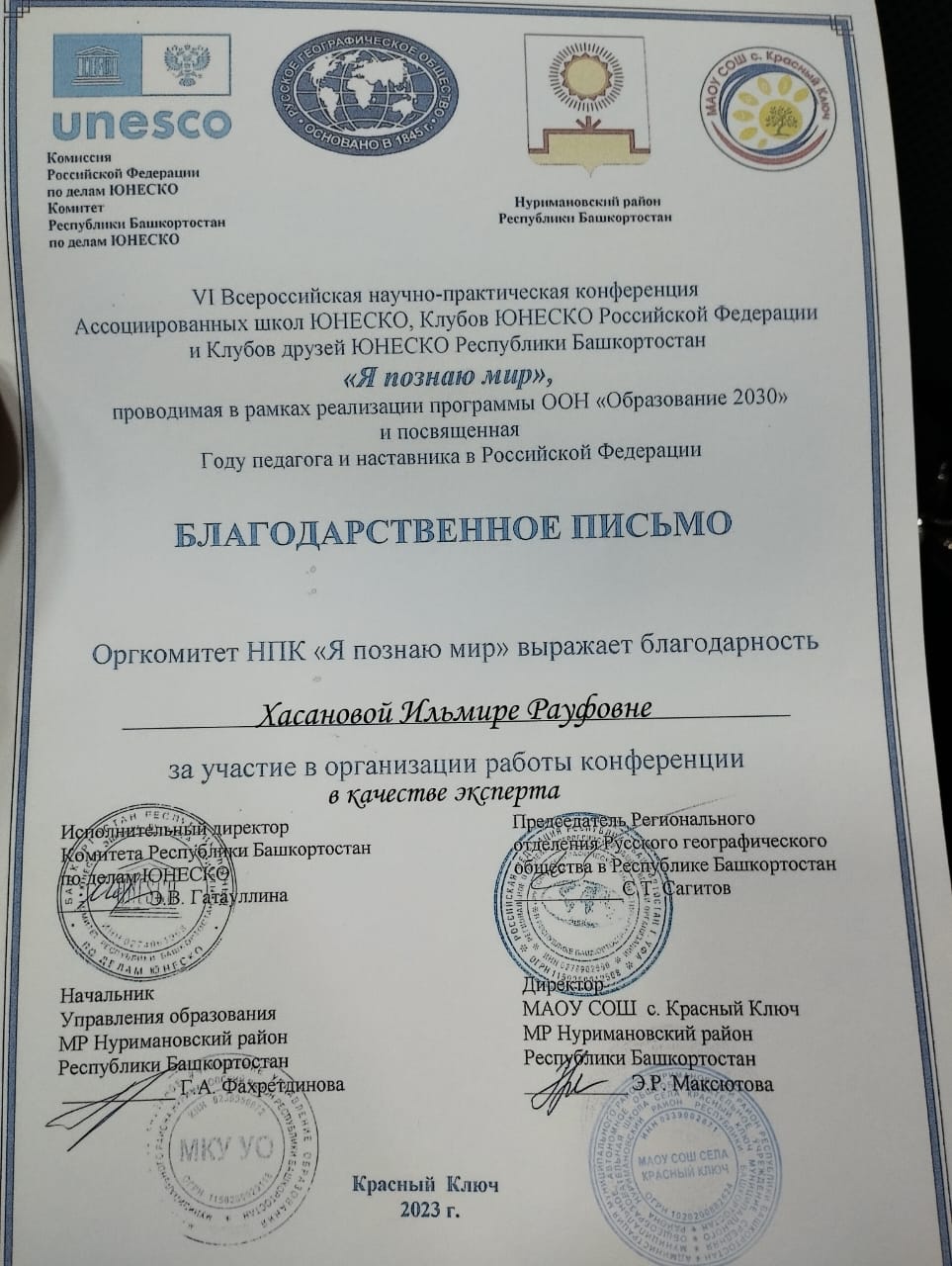 15 декабря на базе МАОУ СОШ с. Красный Ключ в рамках реализации программы ООН «Образование 2030» прошел очный этап VI Всероссийской научно-практической конференции Ассоциированных школ, Клубов ЮНЕСКО Российской Федерации и Клубов друзей ЮНЕСКО Республики Башкортостан «Я познаю мир», посвященной Году педагога и наставника в Российской Федерации.