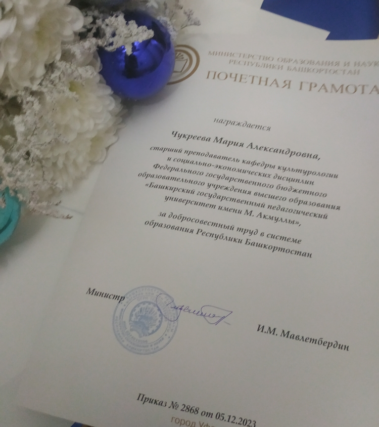 Старший преподаватель М.А. Чукреева получила Почетную грамоту Министерства образования и науки Республики Башкортостан