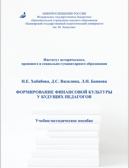 В издательстве БГПУ им. М. Акмуллы опубликовано учебно-методическое пособие «Формирование финансовой культуры у будущих педагогов» (авторы – Хабибова Н.Е., Василина Д.С., Баянова Л.Н.). В нем представлены результаты практической работы, связанной с процессом формирования финансовой культуры студентов – будущих преподавателей экономических и неэкономических дисциплин. В учебно-методическом пособии предлагаются авторские подходы и методический инструментарий к процессу формирования финансовой культуры у студентов педагогических вузов Российской Федерации.
