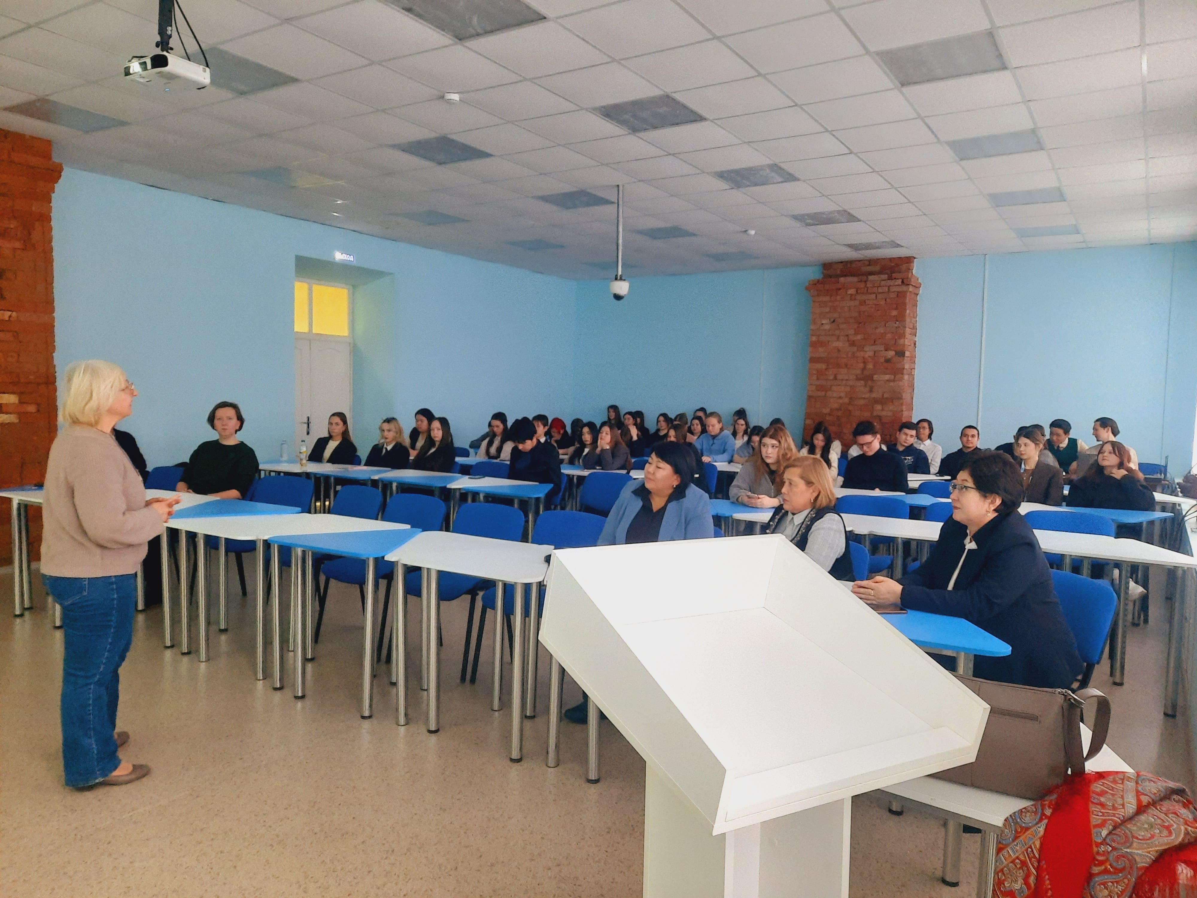 Доцент кафедры экономики и финансов, Кудайбердиева Жанара Арапбаевна рассказала об истории развития их вуза, его структуре, составе своей кафедры, представила презентацию с информацией об университете и профессорско-преподавательском составе, их успехах в области науки и образования.